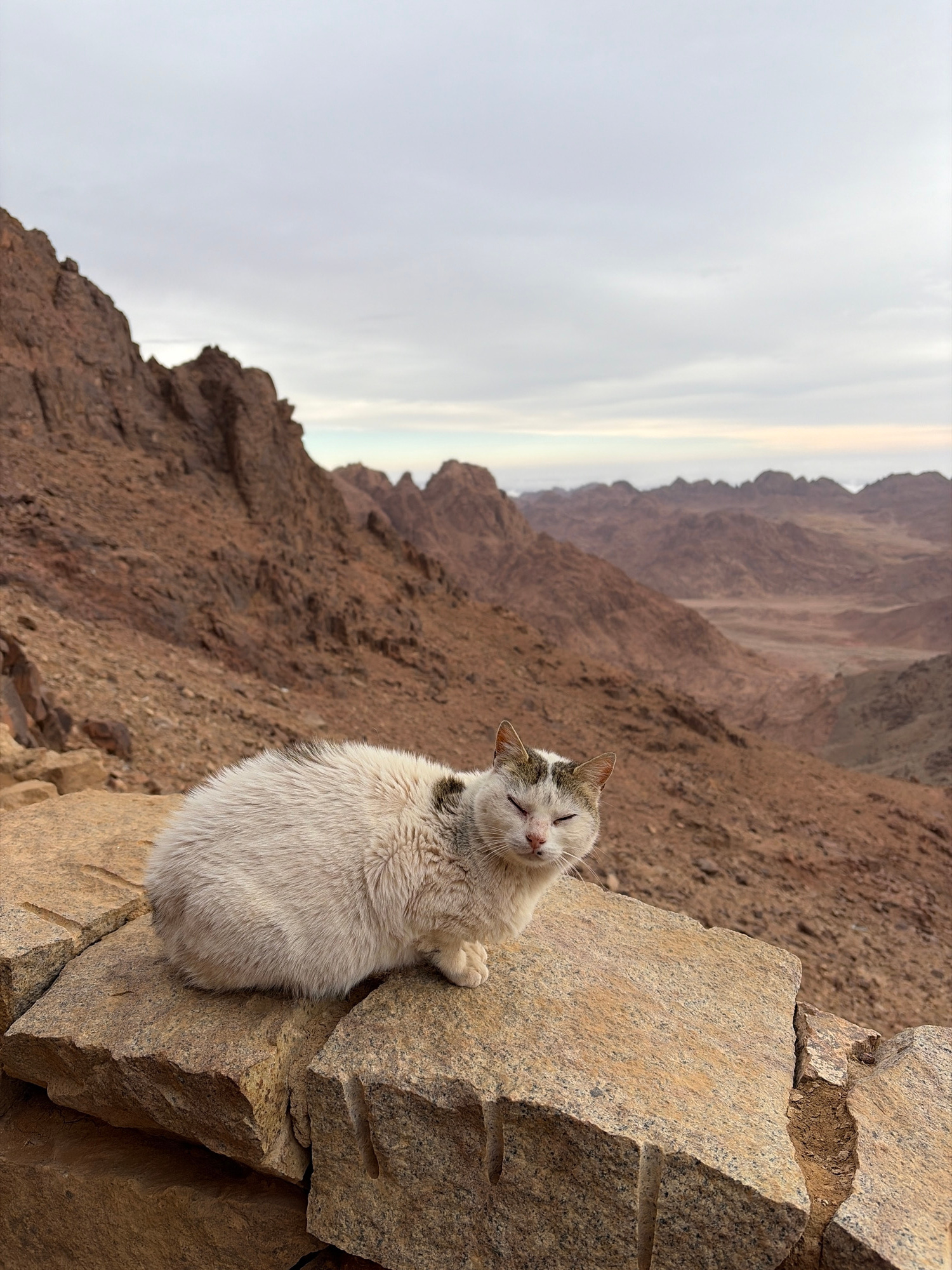 A white cat rests against a rock formation atop Mount Sinai in Saint Catherine, Egypt. The cat's eyes are closed, and its body is positioned vertically against the rock. Behind the cat, the landscape…read more