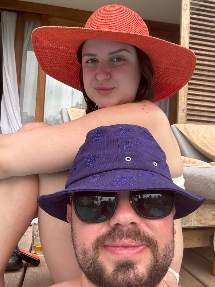 This image captures two individuals in an outdoor resort environment, consistent with locations in Zanzibar, Tanzania. In the foreground, an adult male's face is visible from the nose downwards. He we…read more