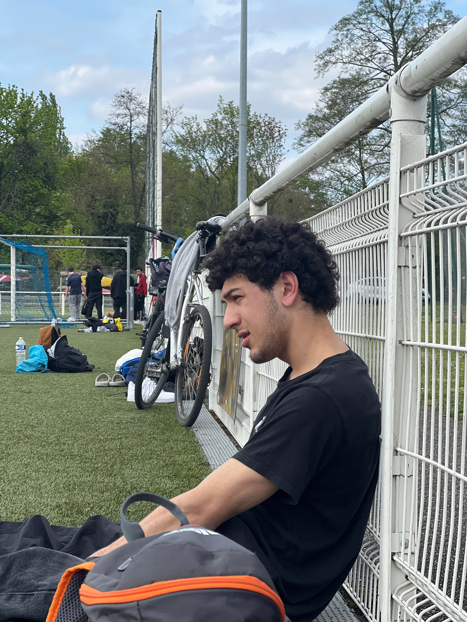 A medium shot, taken from an elevated perspective, depicts a young man with dark curly hair and a black t-shirt, looking down. He is positioned near a white metal structure, possibly a barrier. Behind…read more