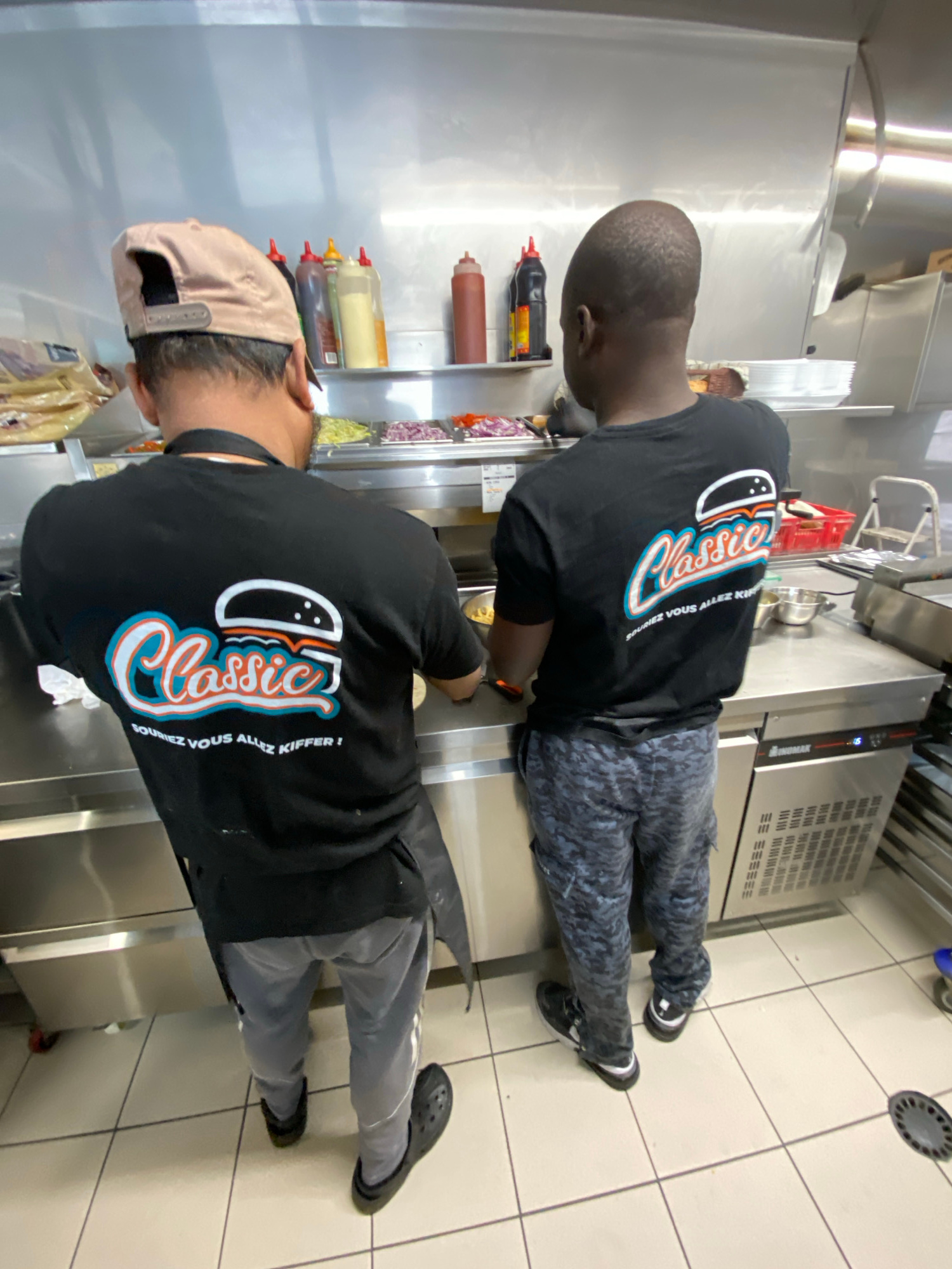 Two men in black shirts with "Classic" written on the back are working in a kitchen. The kitchen is located in Schiltigheim, France. One man is bald and is wearing grey pants with a blue camouflage pa…read more