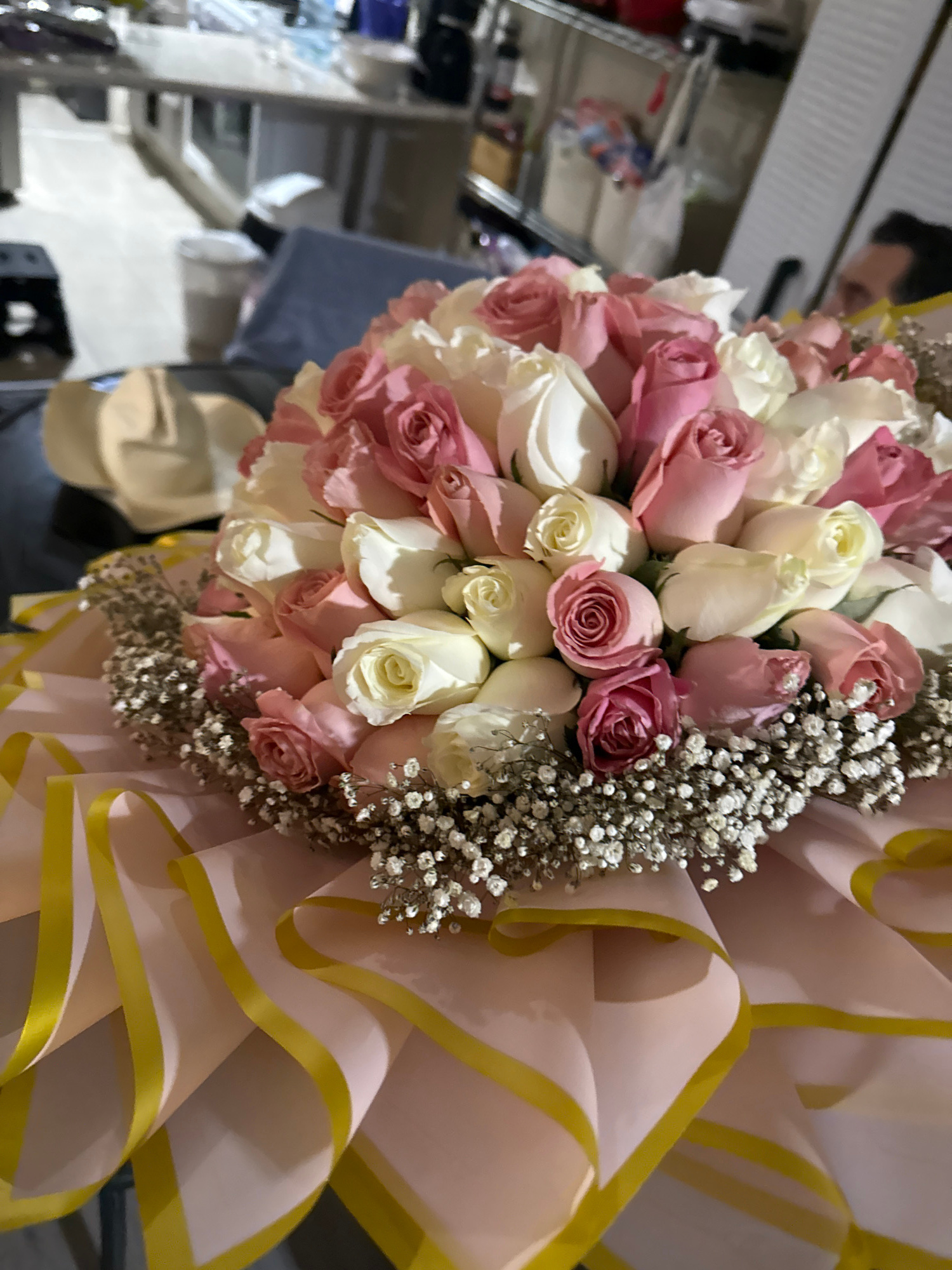 A close-up shot captures a bouquet primarily composed of white and pink roses, accented with baby's breath, and wrapped in a light pink paper with yellow ribbon edging. The image is taken indoors, wit…read more