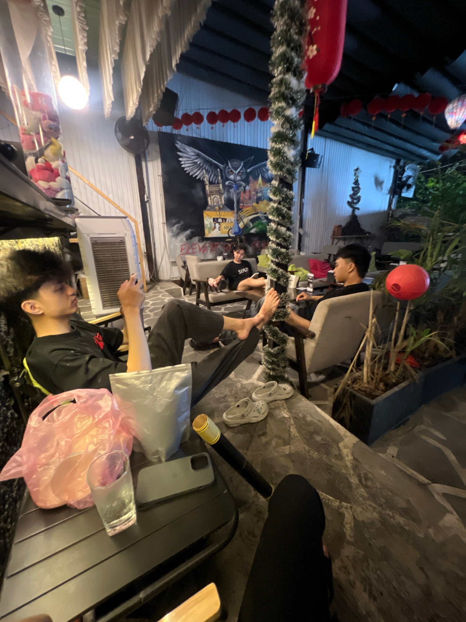 The image depicts an outdoor scene in Đà Nẵng, Vietnam, possibly a courtyard or patio. Several people are present, including at least two men seated and another reclining. One man is wearing dark pant…read more