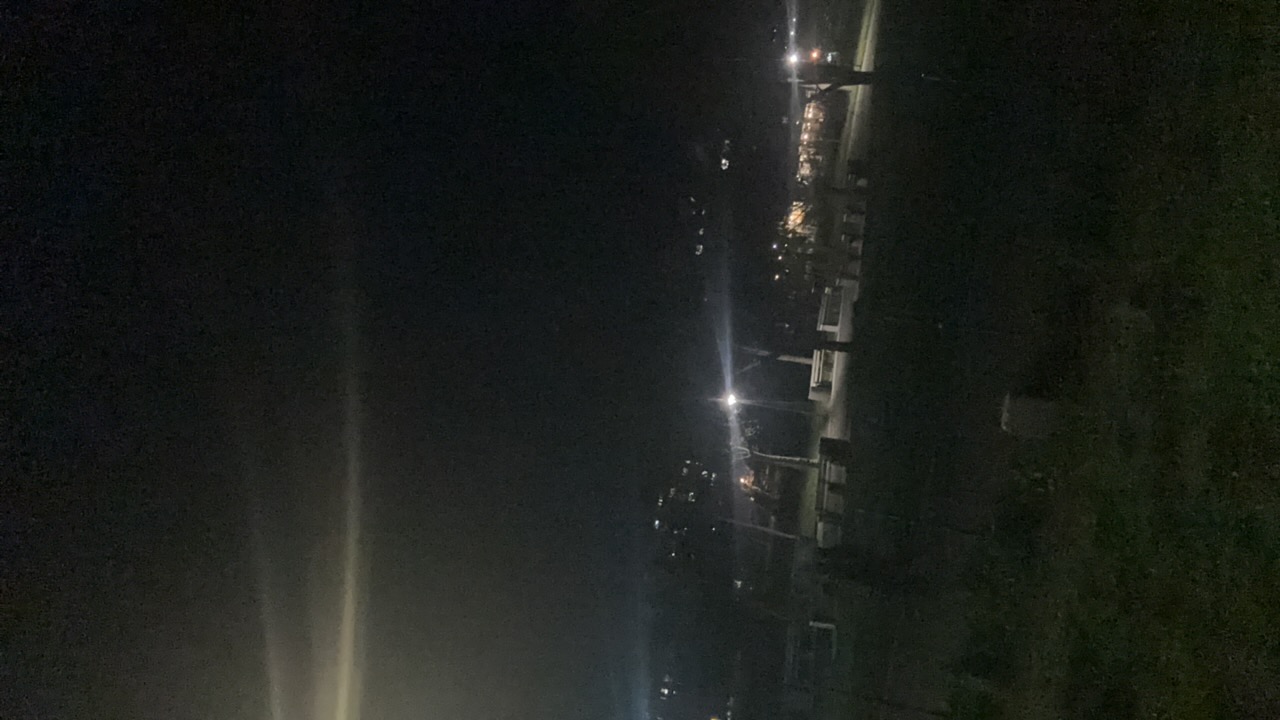 The image shows a nighttime scene in a park in Burgas, Bulgaria. Tall apartment buildings with illuminated windows stand along the left side of the frame, contrasting with the dark sky above. A grassy…read more