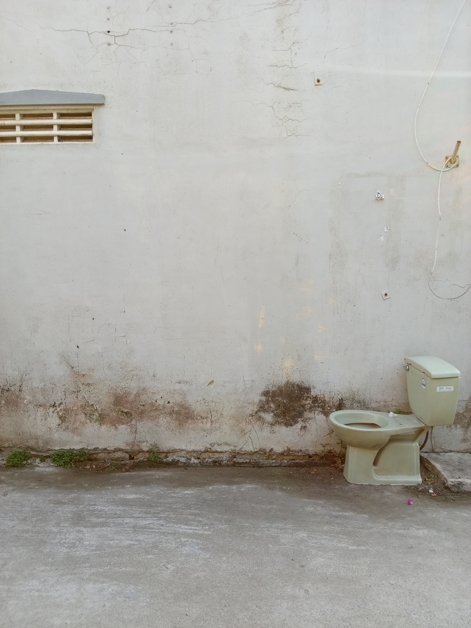 A discarded, light green toilet stands against a weathered white wall in an outdoor setting. The wall shows signs of age, with patches of discoloration and cracked paint. A small vent is visible near…read more