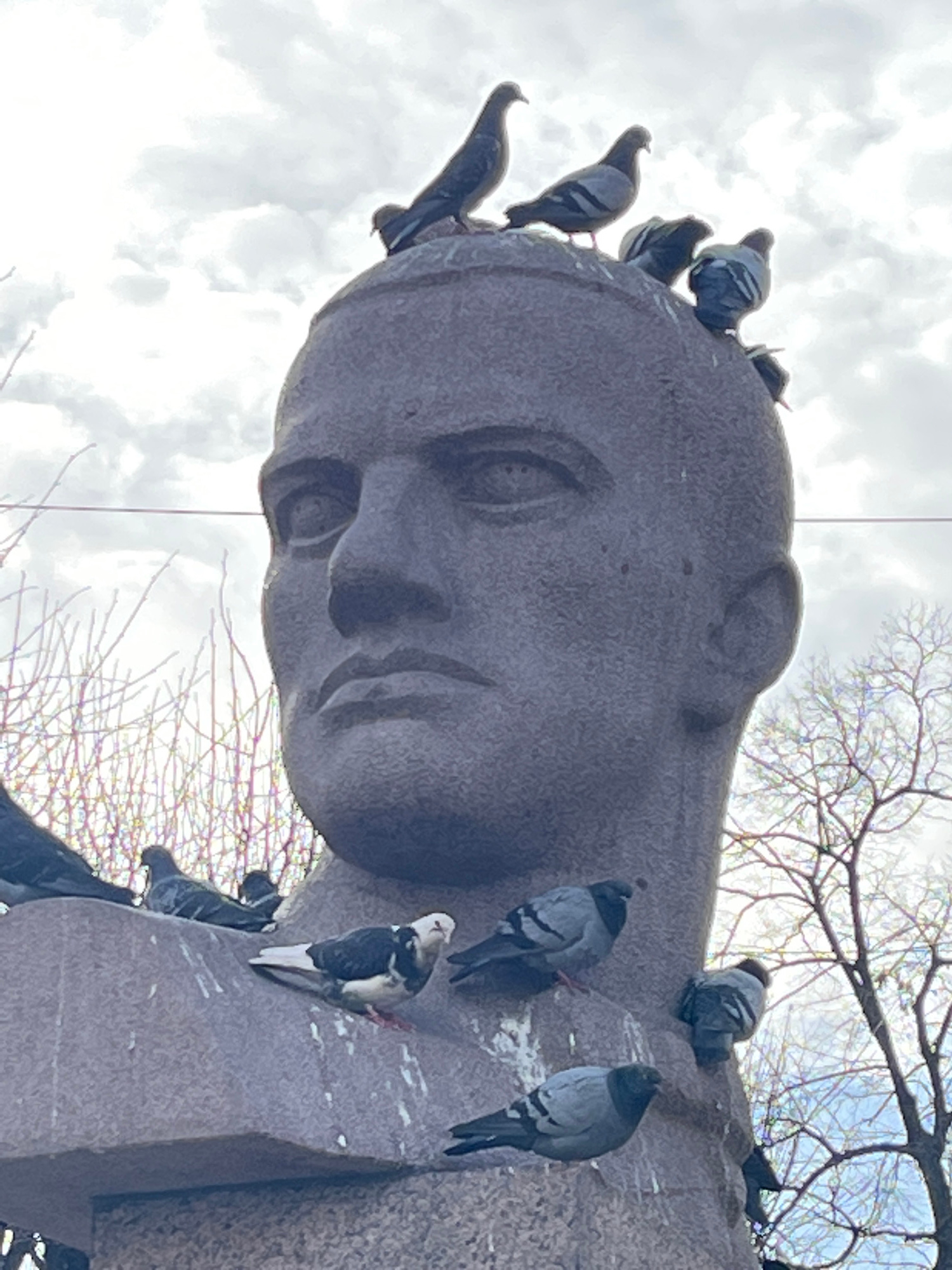 The image shows a granite statue of a human head, likely a monument or artwork, located in Saint Petersburg, Russia. The statue is gray and heavily weathered, with distinct facial features. Multiple p…read more