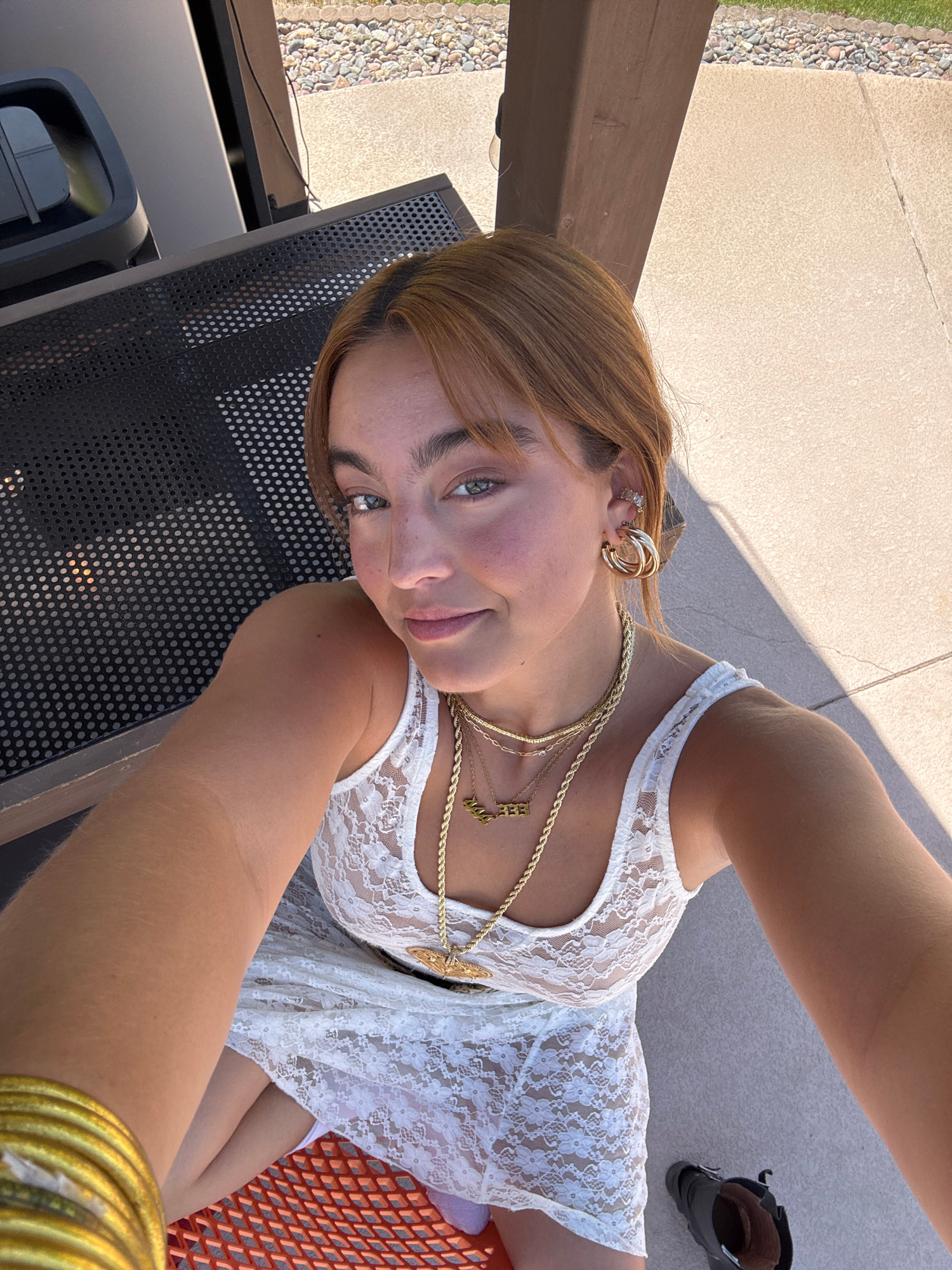 A young woman with fair skin and light brown hair takes a selfie outdoors in Rancho Mirage, United States. She is wearing a short, white, lace dress and multiple gold necklaces and earrings. The locat…read more