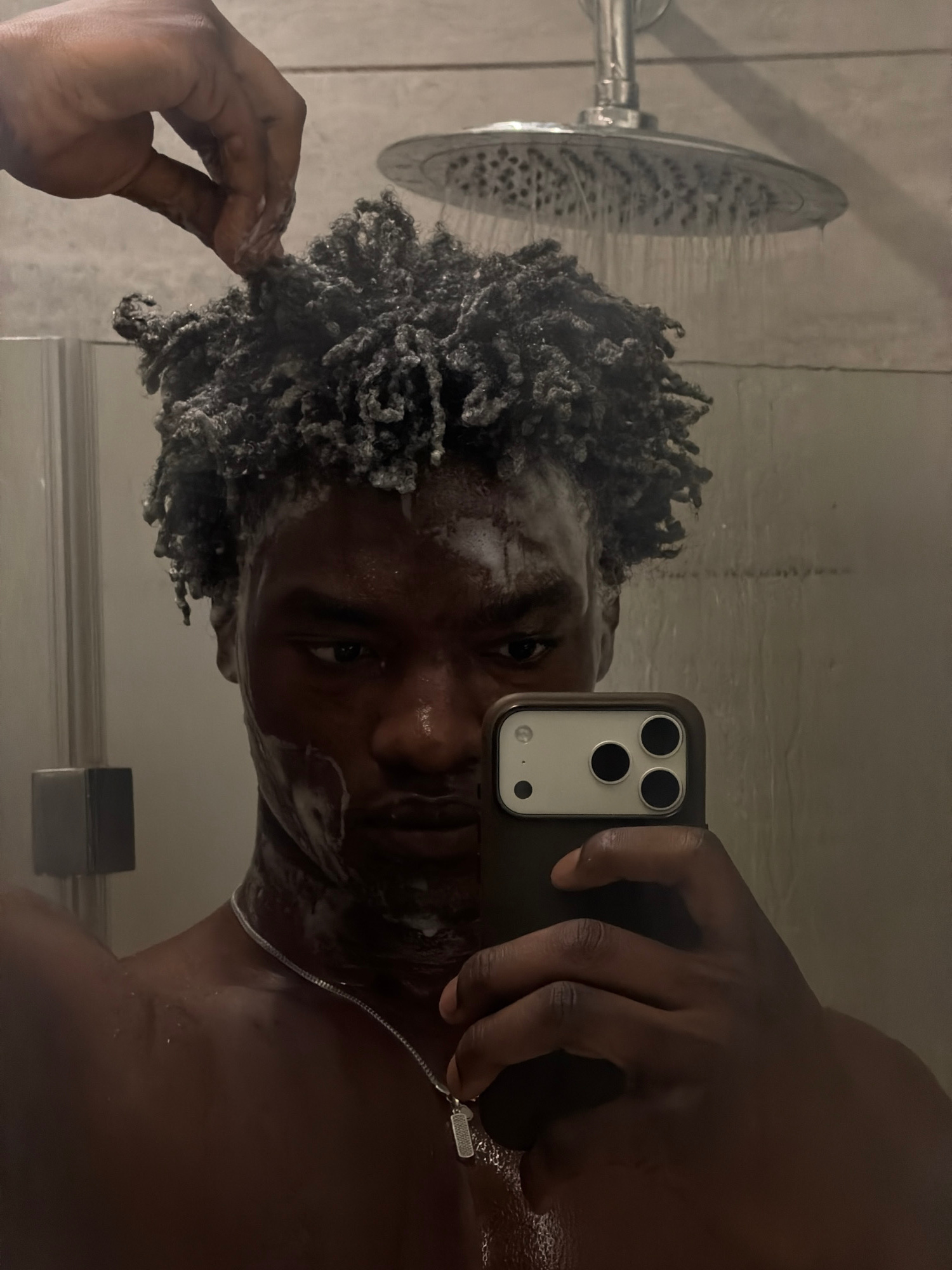 A dark-skinned person is taking a selfie in the shower. The person has short, curly hair that appears to be wet and lathered with soap. A showerhead is visible in the background, with water flowing. T…read more