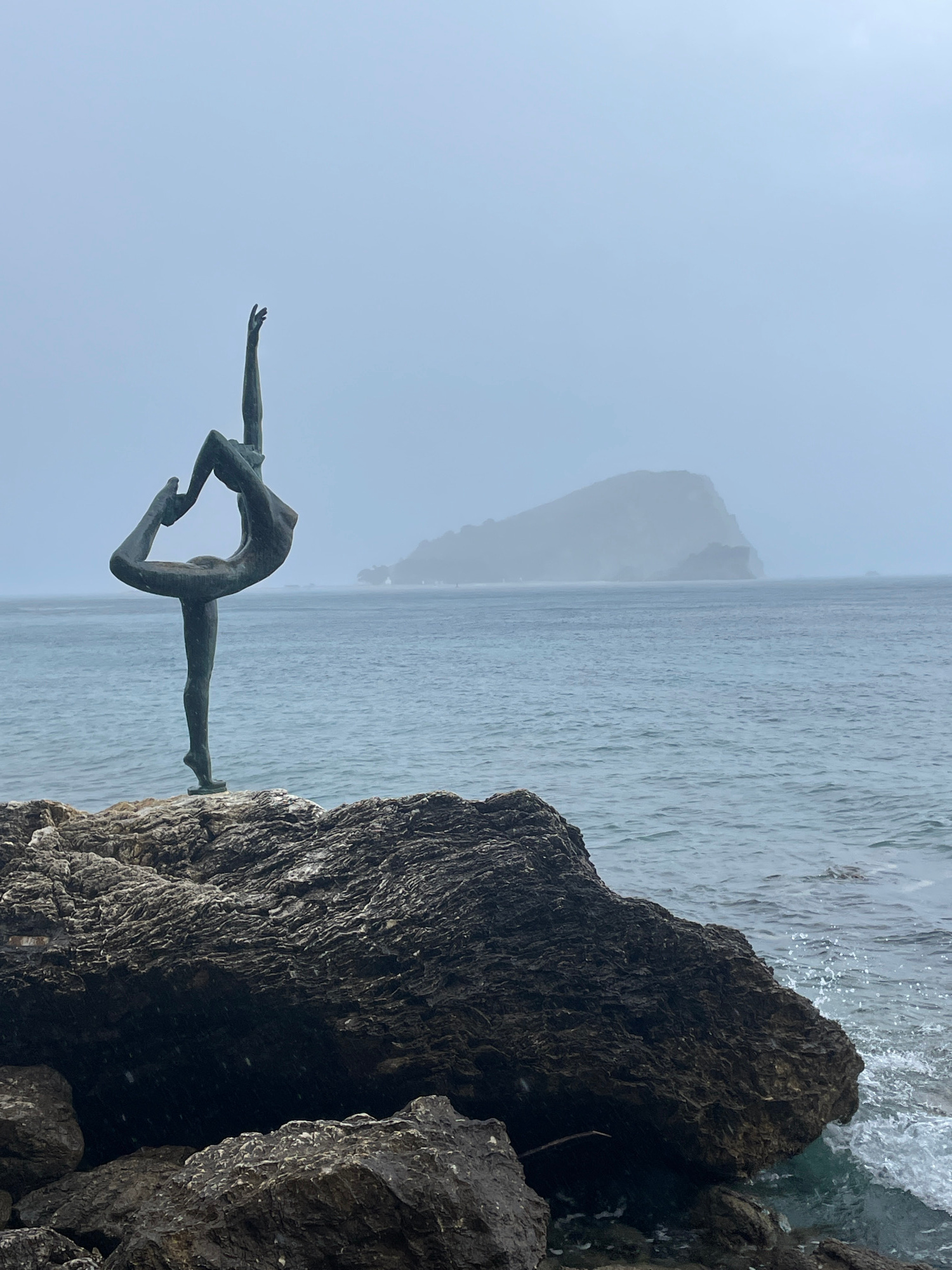 The image depicts the "Dancer from Budva" (Ballerina) statue in Budva, Montenegro, located on the rocky coastline near Mogren Beach. The bronze-colored statue of a slender female figure is poised in a…read more