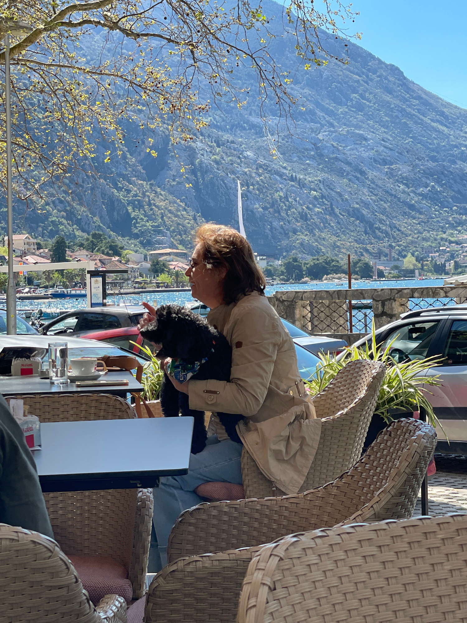 The image shows a woman holding a small black dog at an outdoor cafe in Dobrota, Montenegro. The woman has short brown hair and wears glasses and a tan jacket. She is seated at a wicker table with var…read more