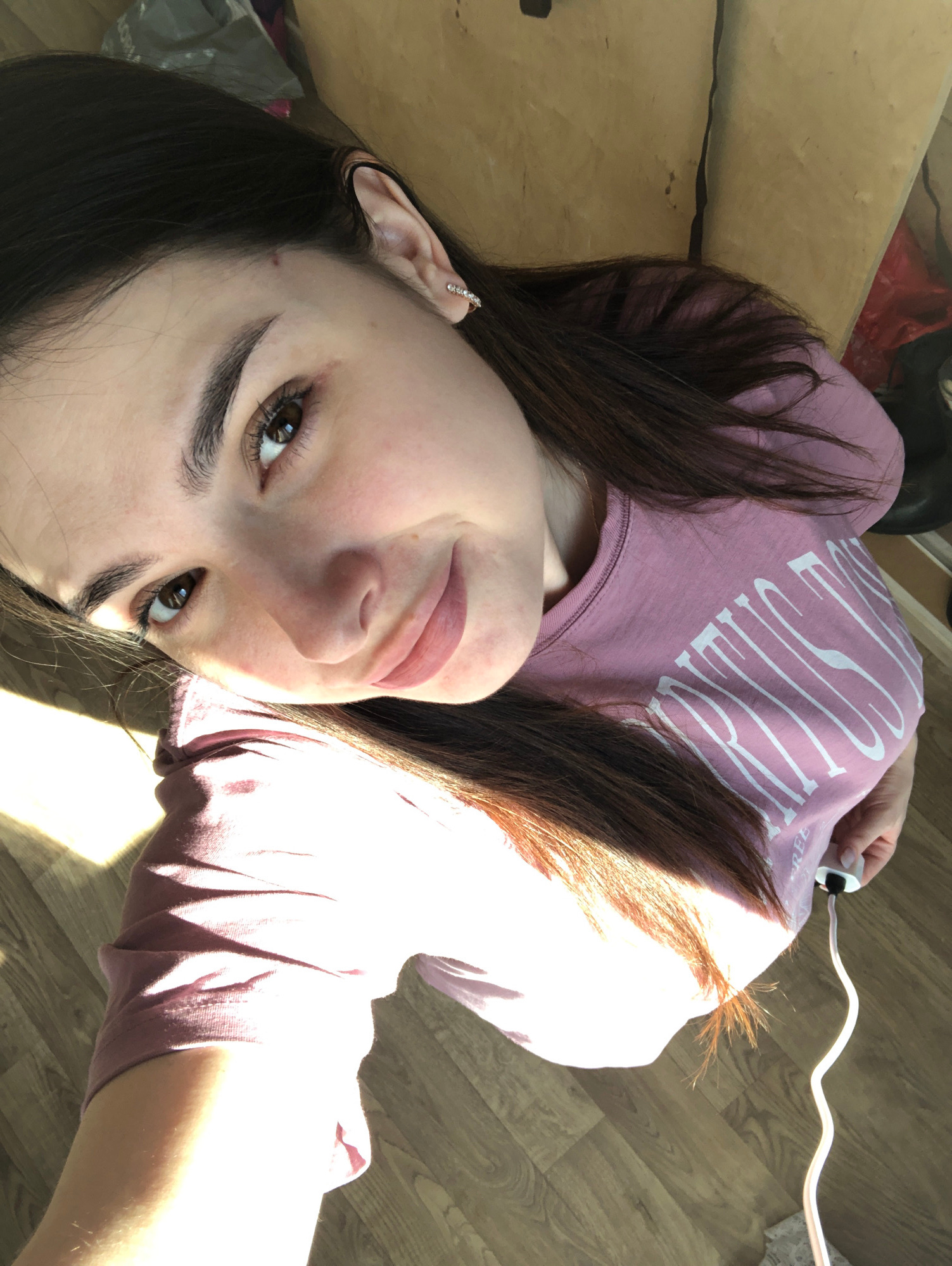 A woman is lying on a wooden floor, wearing a pink long-sleeved shirt. Her dark brown hair frames her face, and she has an earring in her left ear. A white electrical cord is visible near her shoulder…read more