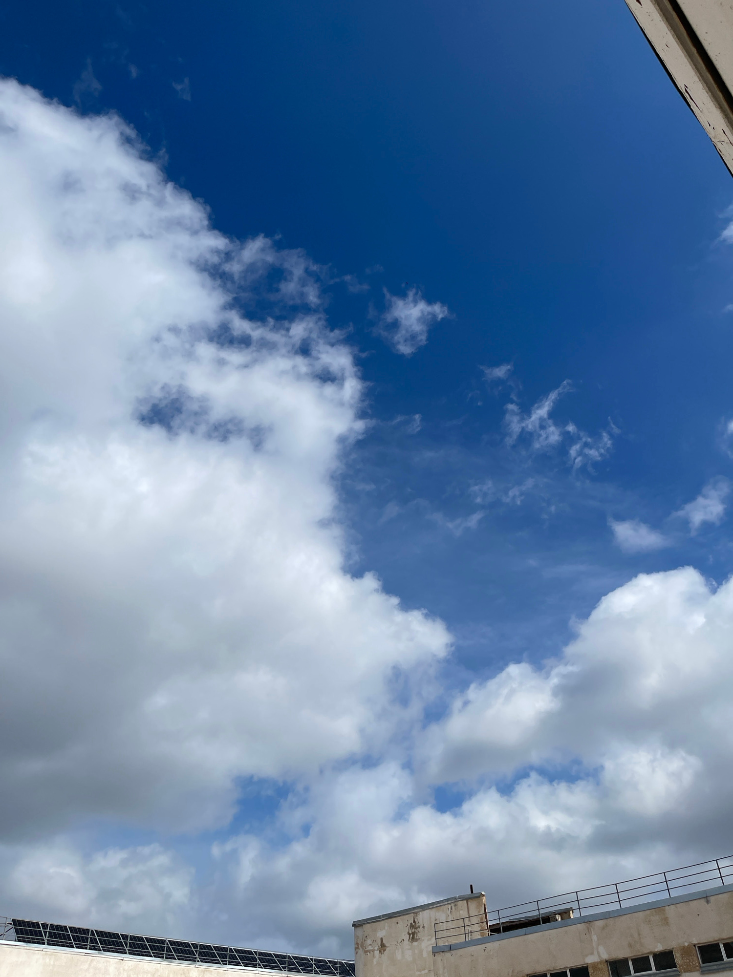 The image shows a view of the sky in Navoiy City, Uzbekistan, with a portion of a building visible in the upper right and upper left corners. The sky is primarily blue, interspersed with white clouds.…read more