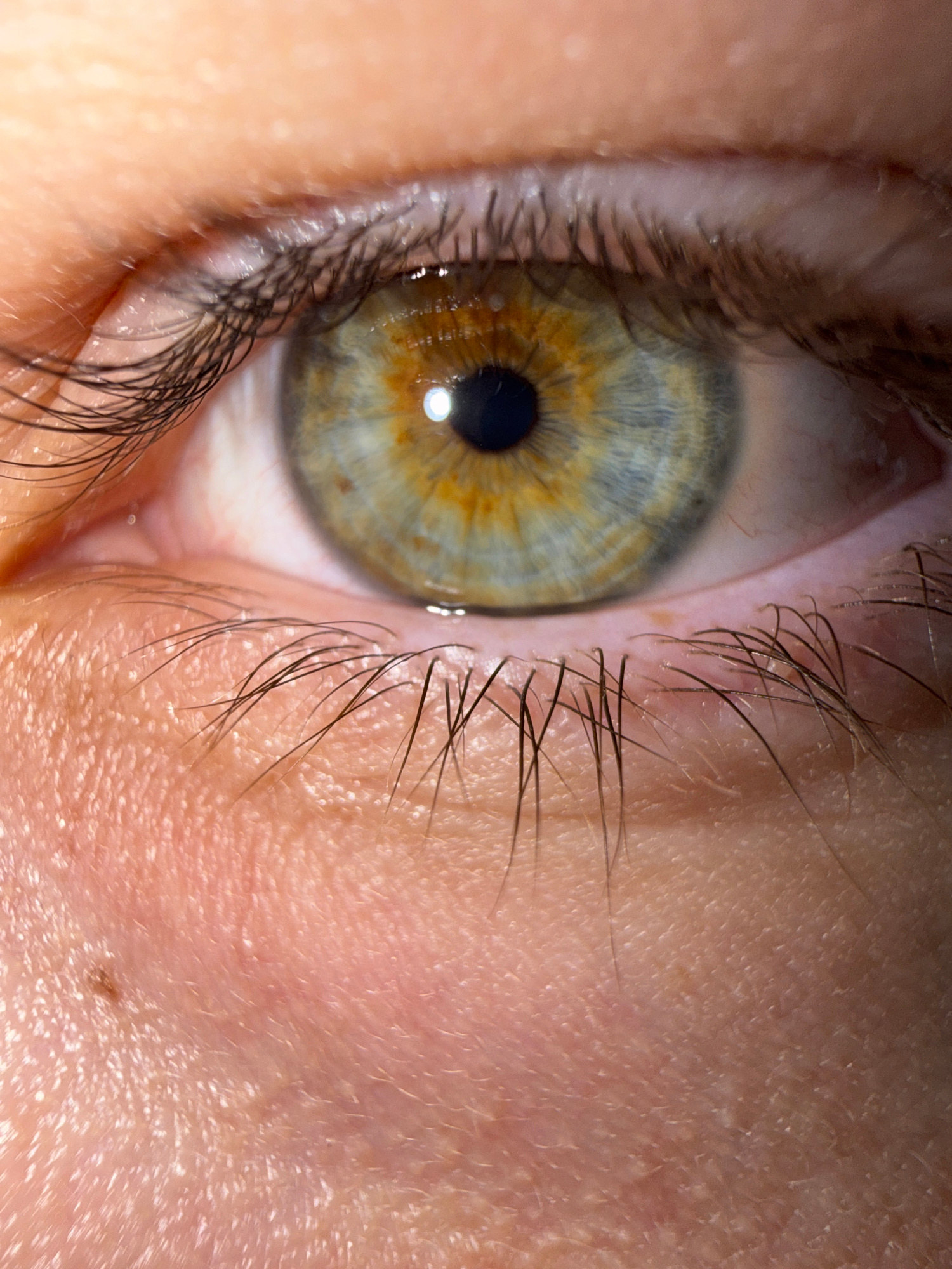 The image is a close-up view of a human eye. The iris is a mix of colors, including blue, green, and brown. The pupil is black and there is a white specular reflection on its surface. Eyelashes are vi…read more