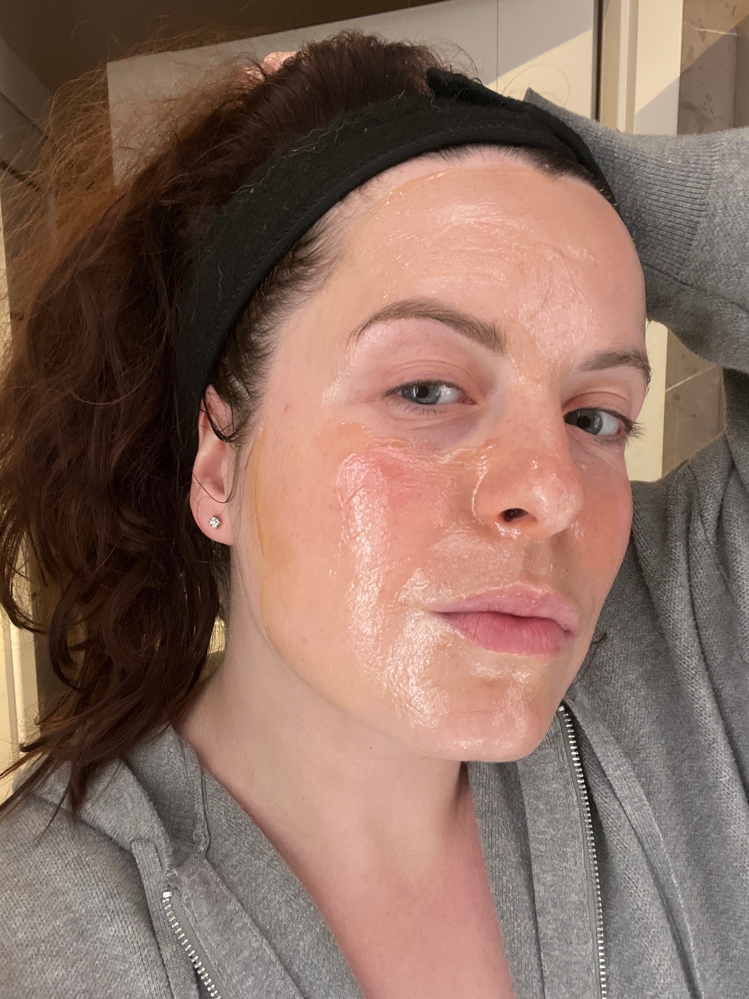 A woman with light skin and dark hair is lying down, wearing a grey zippered sweatshirt. A black headband holds her hair back. She has a clear, shiny substance on her face, possibly a mask or serum. S…read more