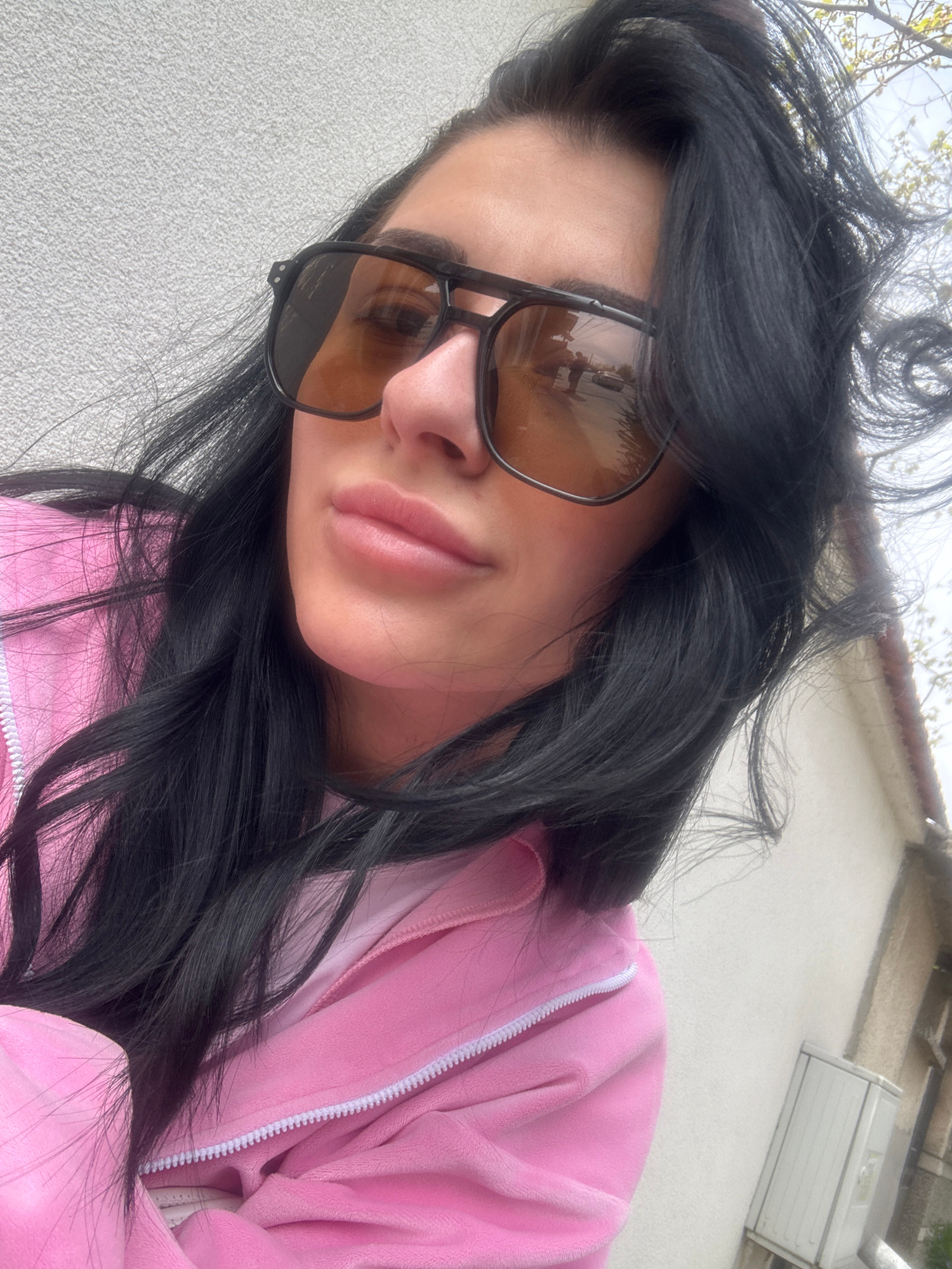 A woman with dark hair and sunglasses is wearing a pink velvet jacket with a white zipper. The background consists of a white wall, part of a building, and some sky with tree branches. The photograph…read more