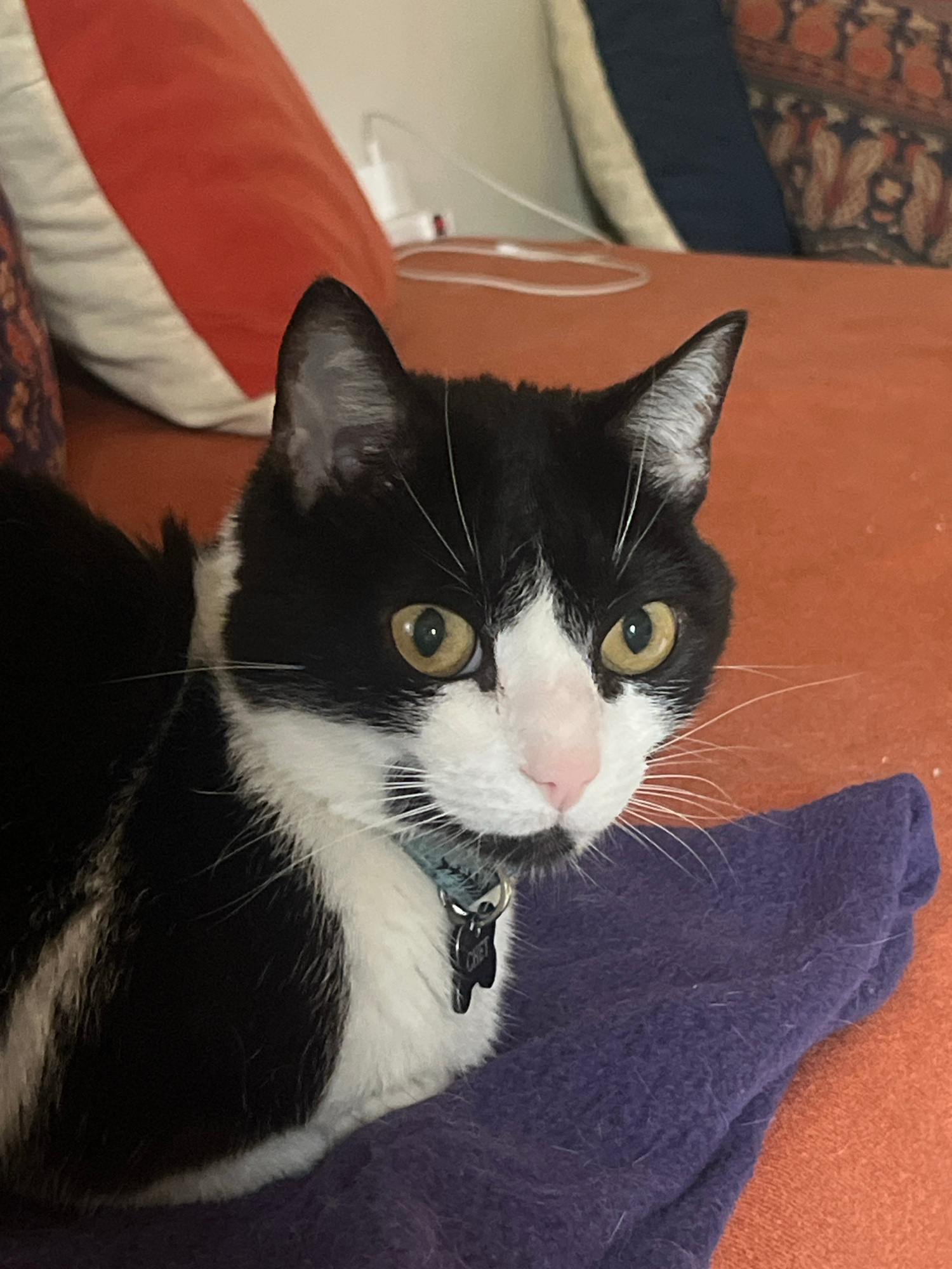 The image depicts a black and white cat with yellow-green eyes, a pink nose, and a collar, lying on an orange couch with a purple blanket. There are other pillows visible in the background, including…read more