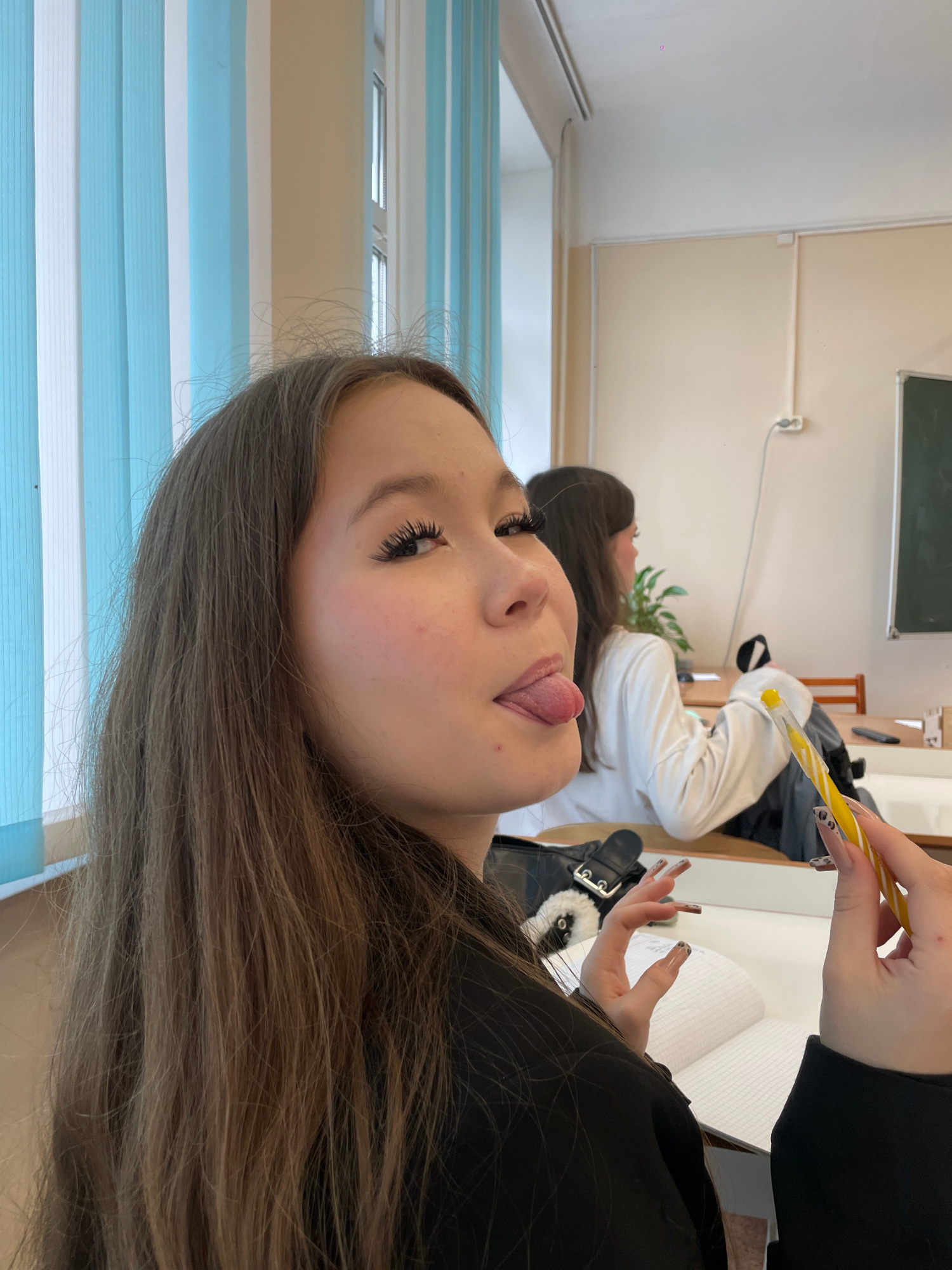 A female teenager is in the foreground, sticking her tongue out towards the camera. The background is a classroom setting, featuring a whiteboard, desks, and other students. The scene appears to be in…read more