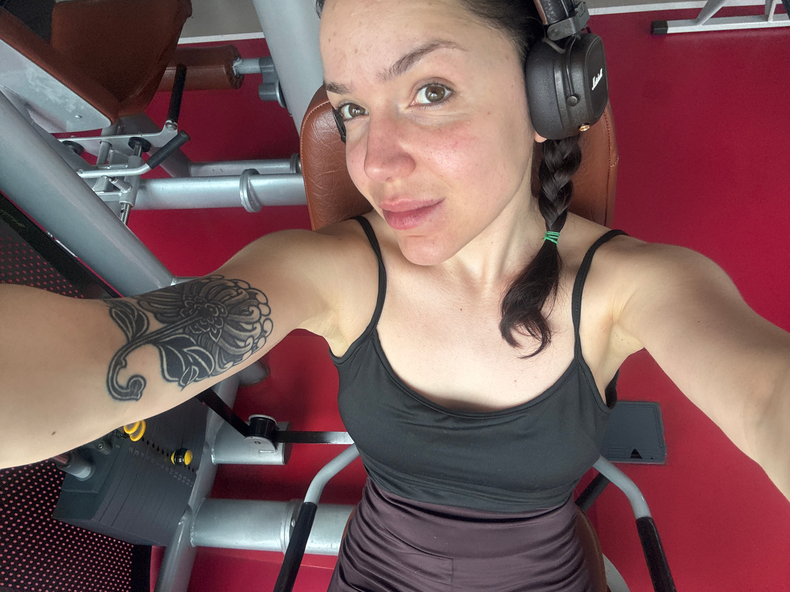 A woman with a braided hairstyle and a black tattoo on her right arm is lying on a brown bench in a gym. She is wearing a black tank top and a purple tank top underneath. Headphones are partially visi…read more