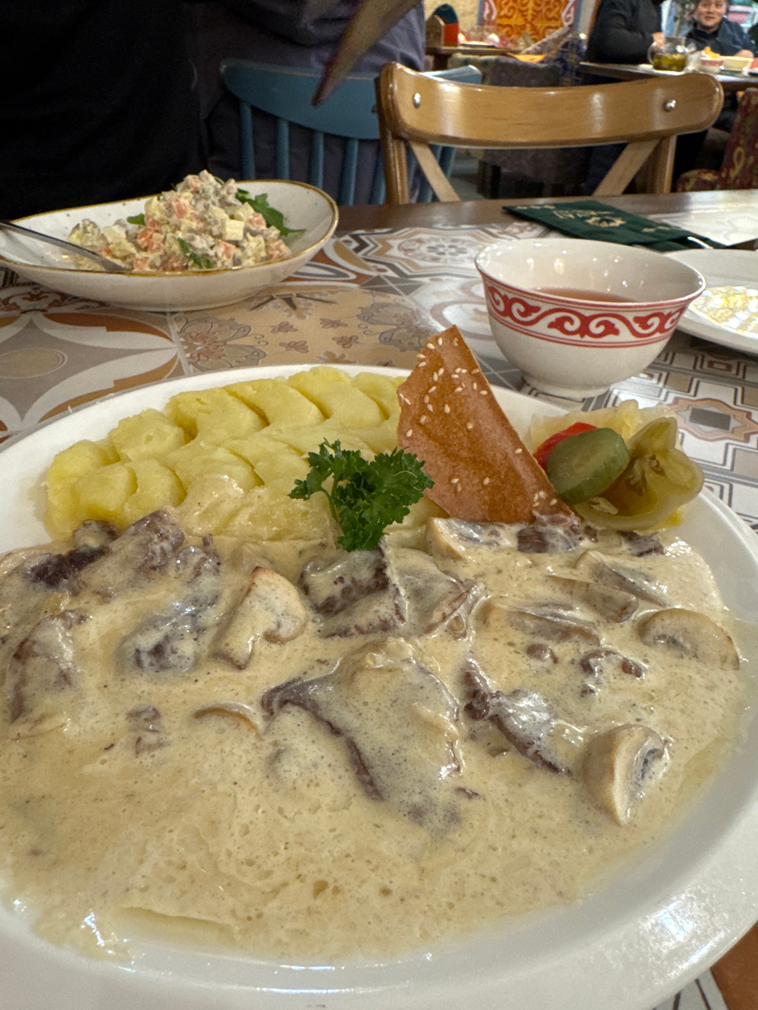 A close-up, slightly tilted view captures a hearty meal served on a patterned table, likely in a restaurant or cafe in Bishkek City, Kyrgyzstan. The central focus is a large white plate presenting a g…read more