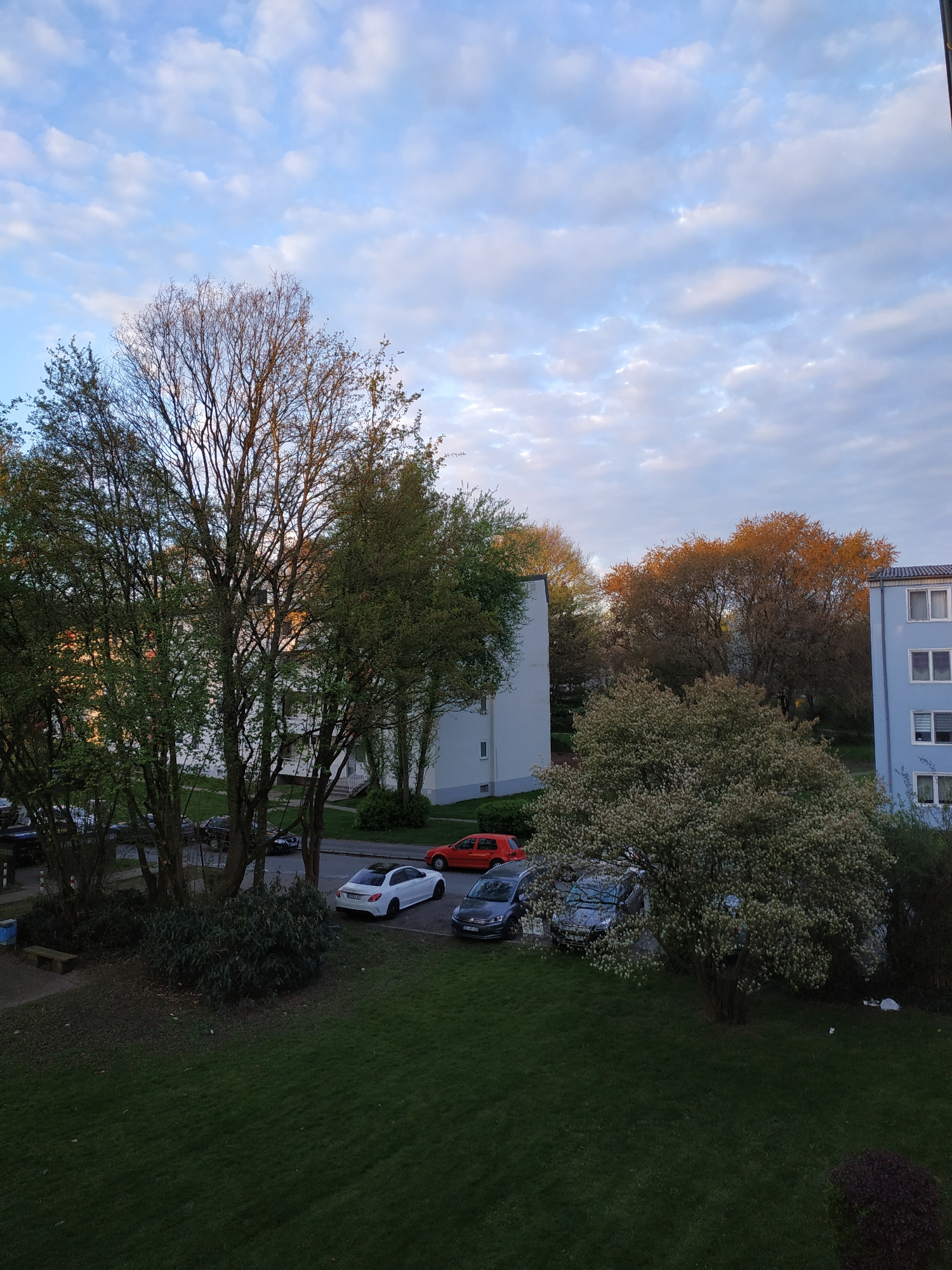 The image shows a view of a residential area in Dortmund, Germany, likely taken from an elevated position, possibly a high-rise apartment. The sky is partially cloudy with blue patches. Several apartm…read more