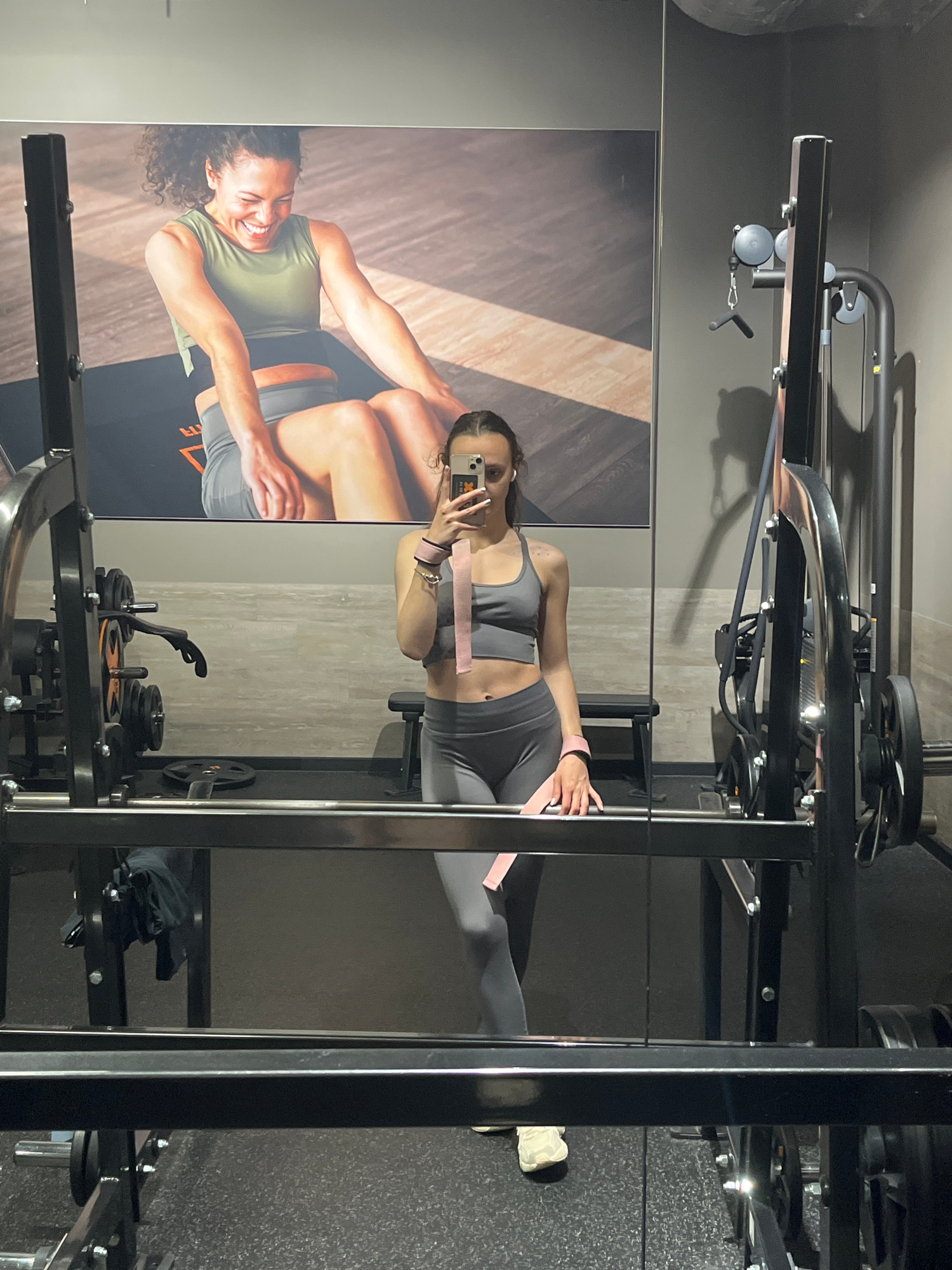A woman takes a selfie in a gym, with a weight machine and a large poster visible in the background. The location is likely in Saarbrücken, Germany. The gym has typical gym equipment, and the woman is…read more