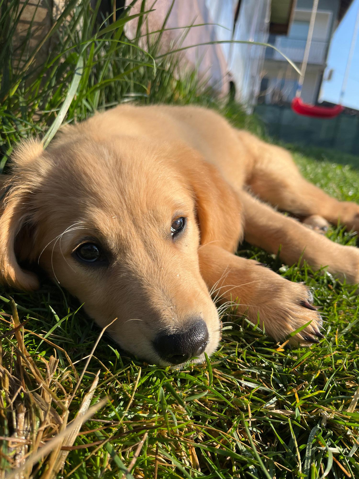 A close-up, medium shot depicts a Golden Retriever puppy lying in grass. The puppy has a black nose, brown eyes, and light tan fur. Green grass surrounds the puppy. Part of a building is visible in th…read more
