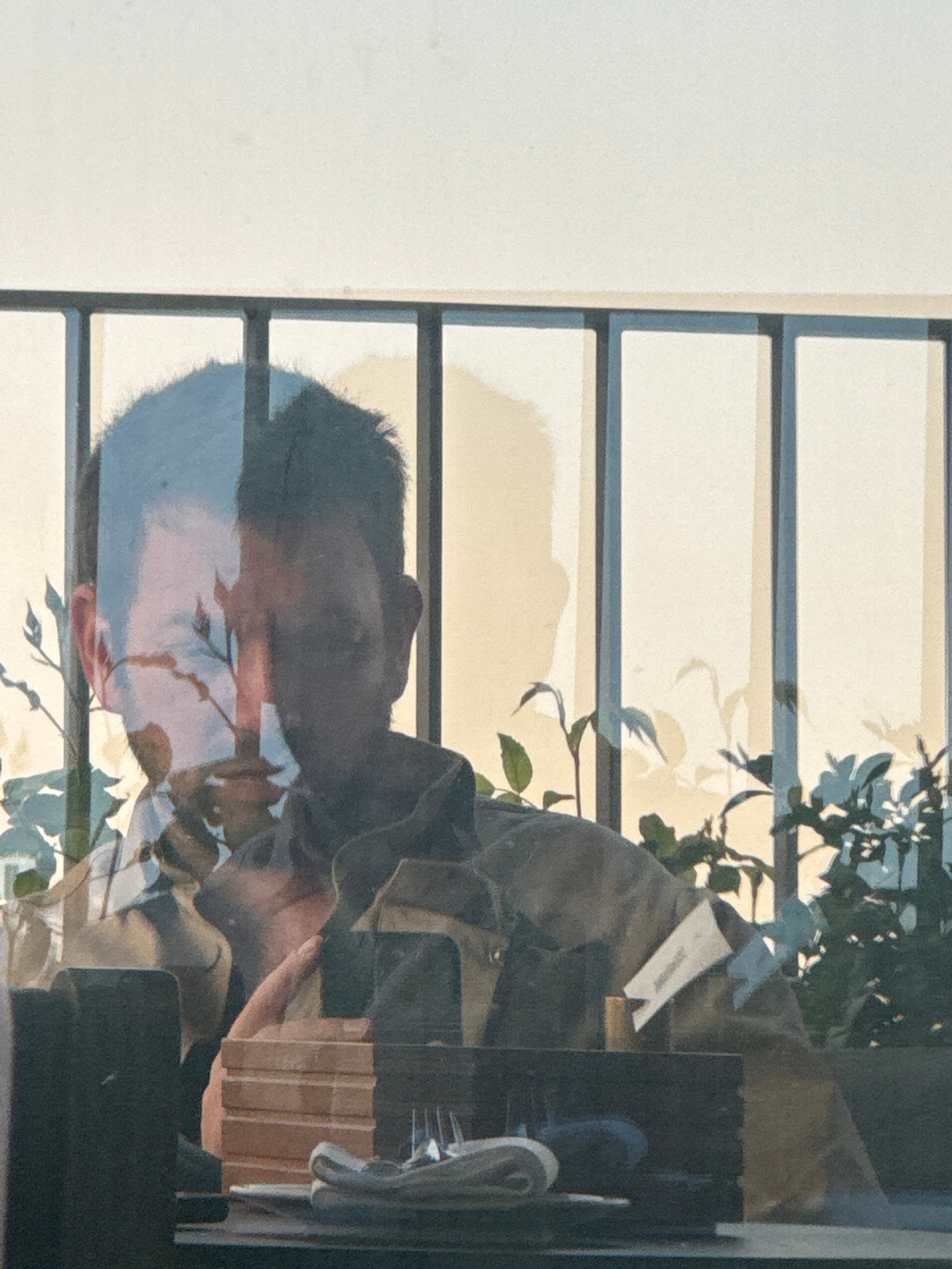 The image shows a person sitting at a table reflected in a window with a grid-like frame. The reflection also includes a leafy plant, suggesting it is outside. On the table, there is a plate with what…read more