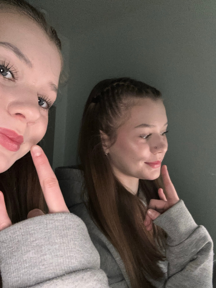 Two young women pose in a selfie. One girl is in the foreground, with fair skin, long eyelashes, and red lipstick. She points to her cheek. The other girl is partially visible in the background, with…read more