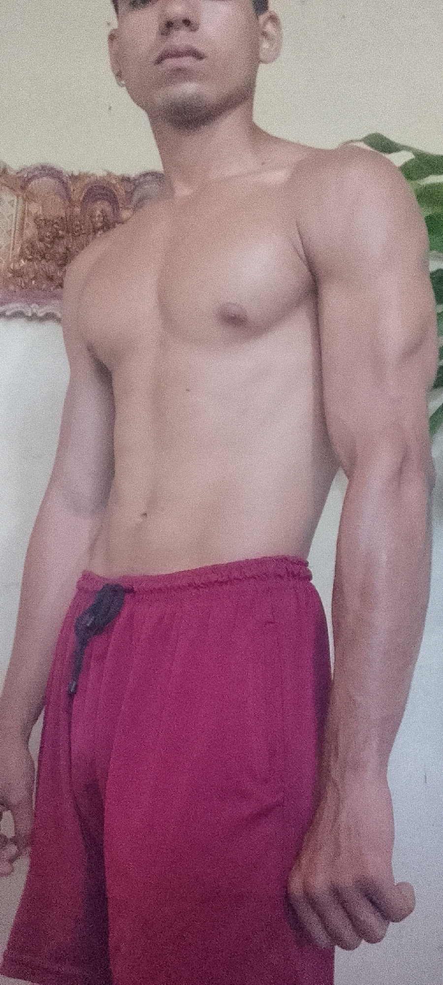 An indoor vertical shot depicts a young, muscular male, shirtless, facing slightly to his left. He wears red athletic shorts secured by a dark drawstring, visible on his left side. His left hand is pa…read more