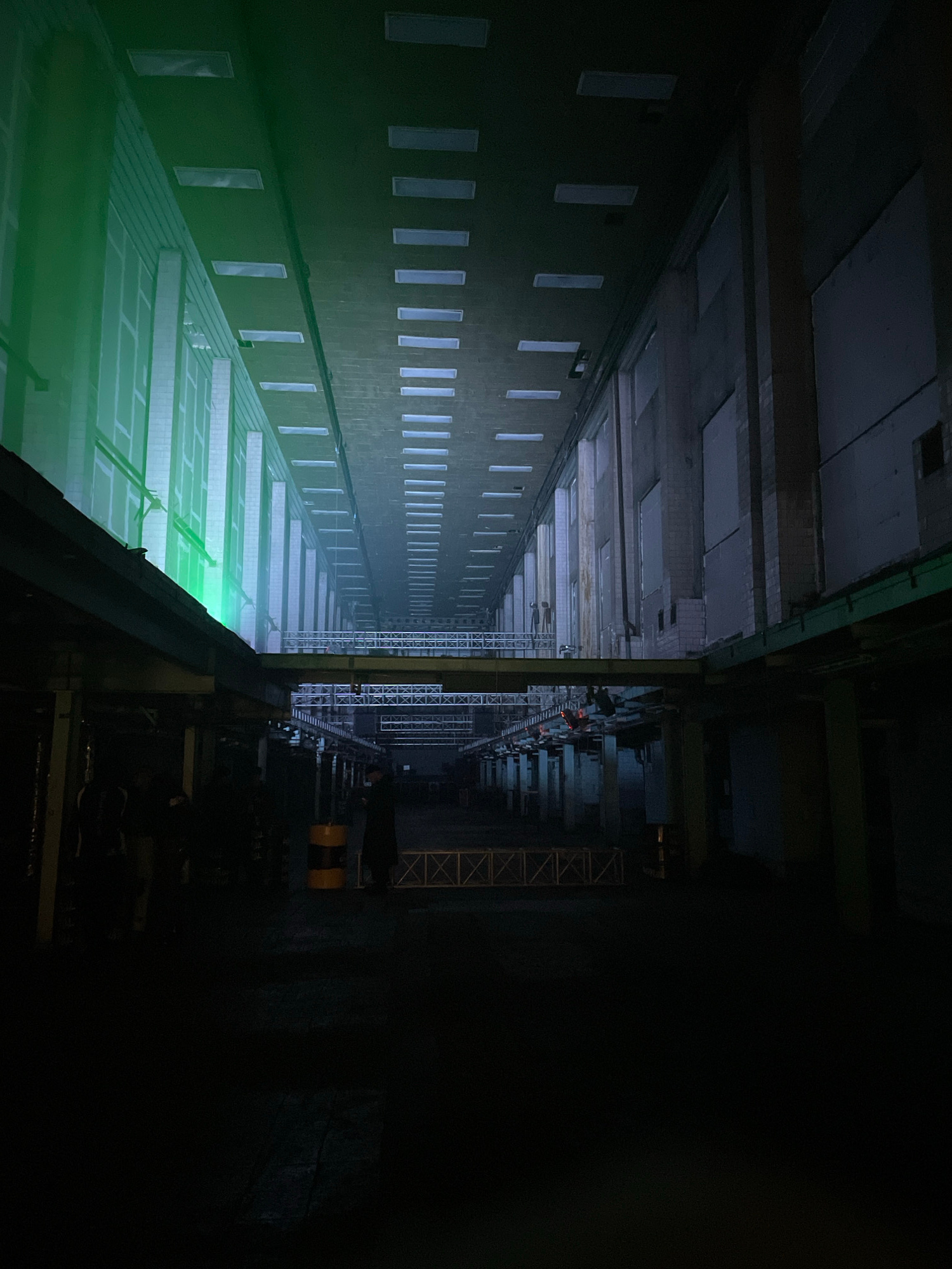 The image depicts a long, dark industrial hall or warehouse. A row of evenly spaced, narrow windows runs along the left wall of the hall, and rectangular panels are visible on the floor below them. Th…read more