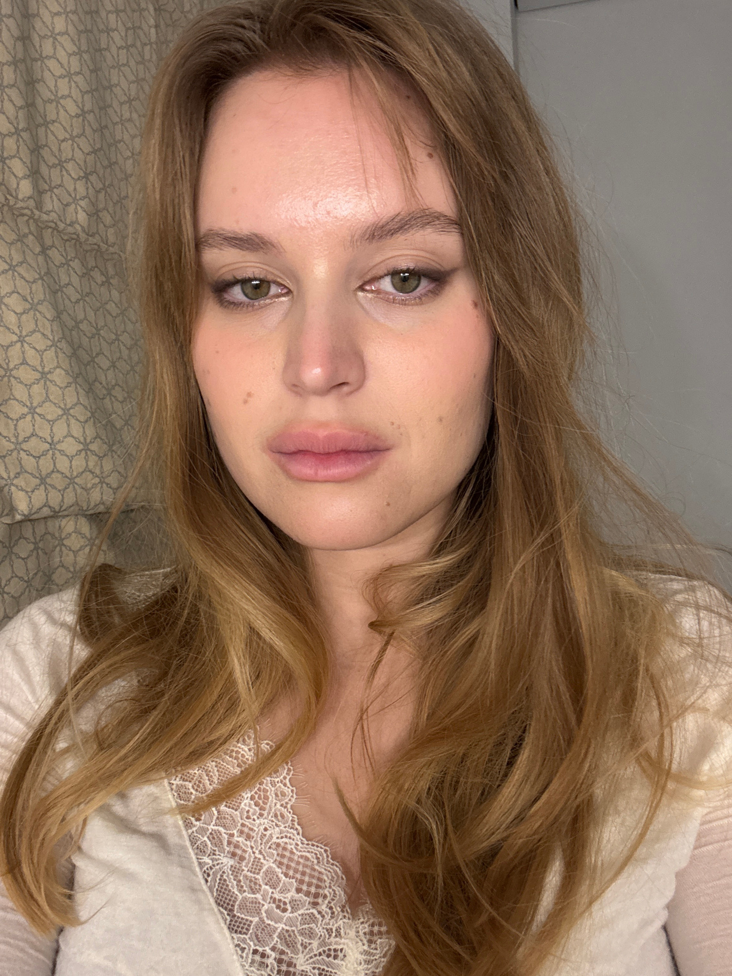A young woman with long, light brown hair is lying down. Her head rests on a patterned pillow or bedsheet, and she looks directly at the camera. She has fair skin, green eyes, and full lips. She is we…read more