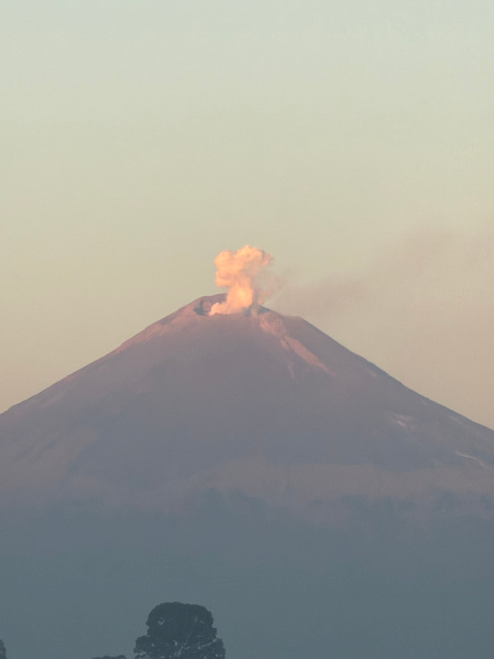 The image displays a large, conical stratovolcano with an active eruption, observed from San Bernardino Tlaxcalancingo, Mexico. A dense, irregularly shaped plume of smoke and ash, exhibiting a warm ye…read more