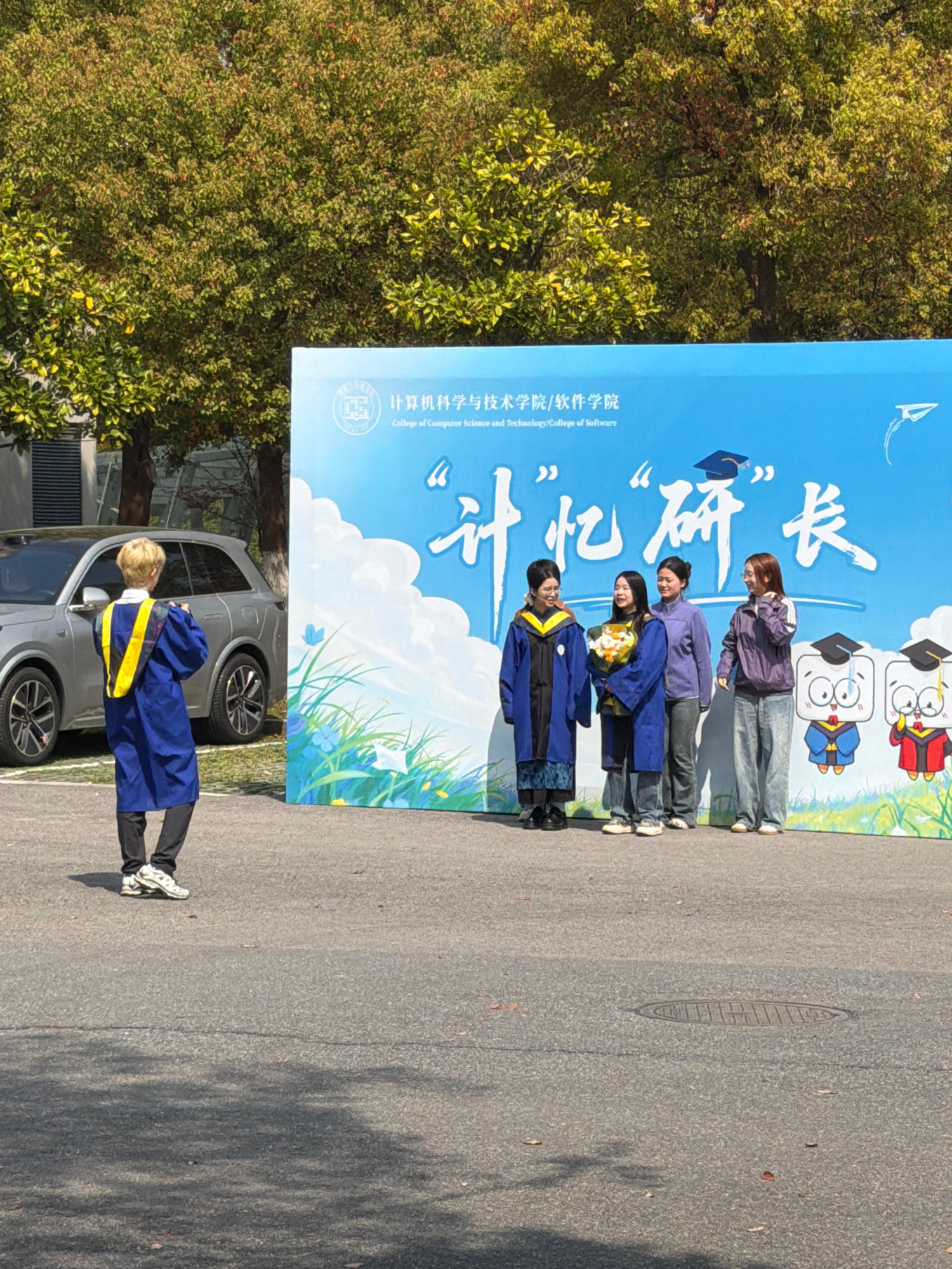 Here is a description of the image: The image shows an outdoor scene, likely a campus area, based on the presence of trees and pavement. The photograph features a vertical banner with a blue backgrou…read more
