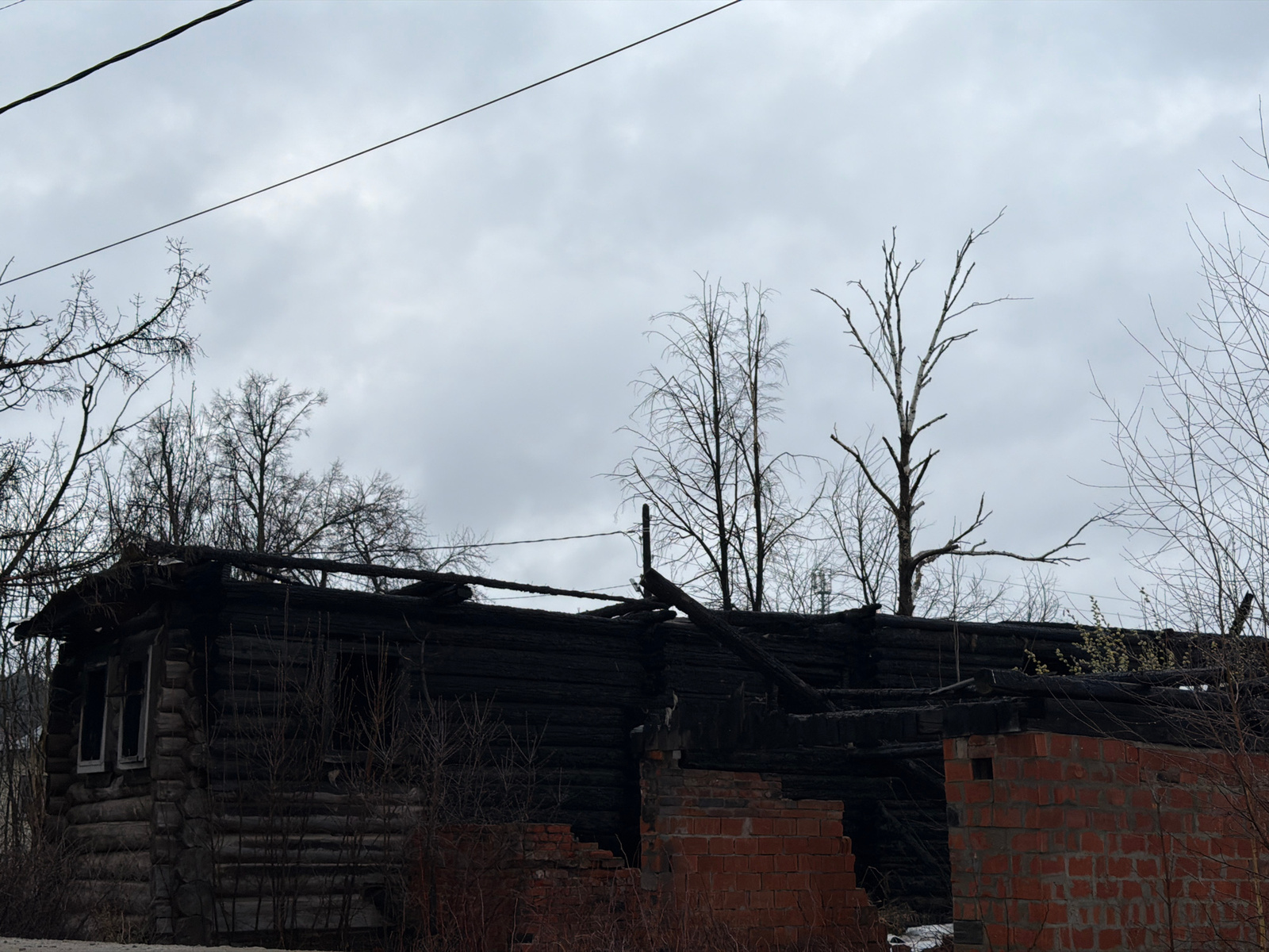 The image depicts the aftermath of a fire at a building in what appears to be a rural or semi-rural setting. The structure is a combination of charred logs and brickwork, indicating both the originalβ¦read more