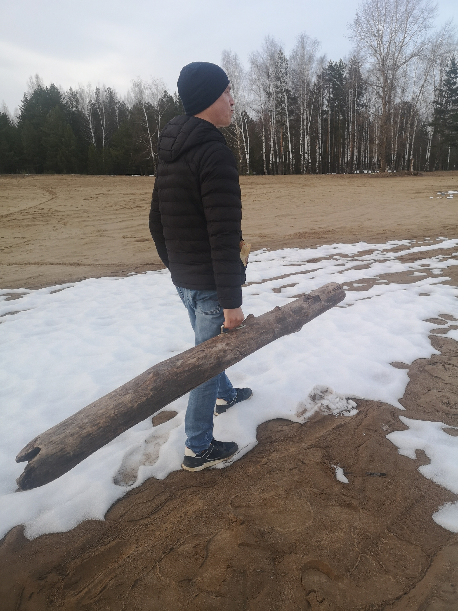 A man stands on a sandy beach with patches of snow. He is wearing a black puffer jacket, blue jeans, a dark beanie, and athletic shoes. He holds a large, weathered log horizontally in his hands. The b…read more
