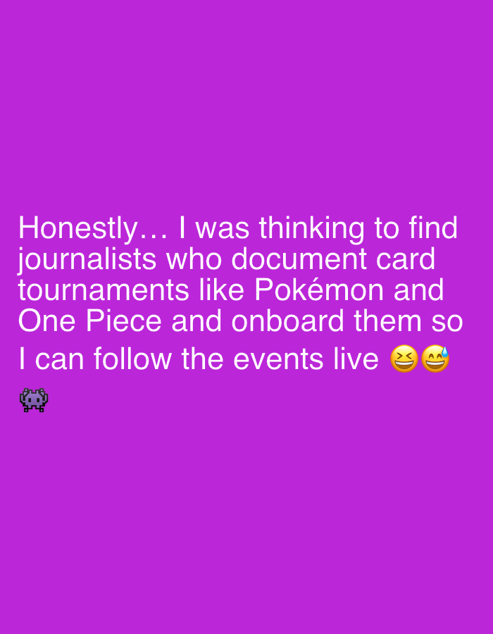 The image is a purple background with white text that reads, "Honestly... I was thinking to find journalists who document card tournaments like Pokémon and One Piece and onboard them so I can follow t…read more