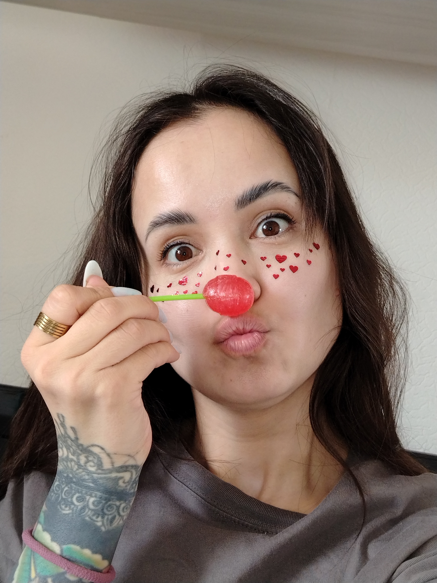 A close-up, brightly lit selfie portrays a young woman indoors in Noviy, Russia, engaged in a playful activity. She has long, dark hair, brown eyes, and fair skin, with well-groomed eyebrows. Her eyesβ¦read more