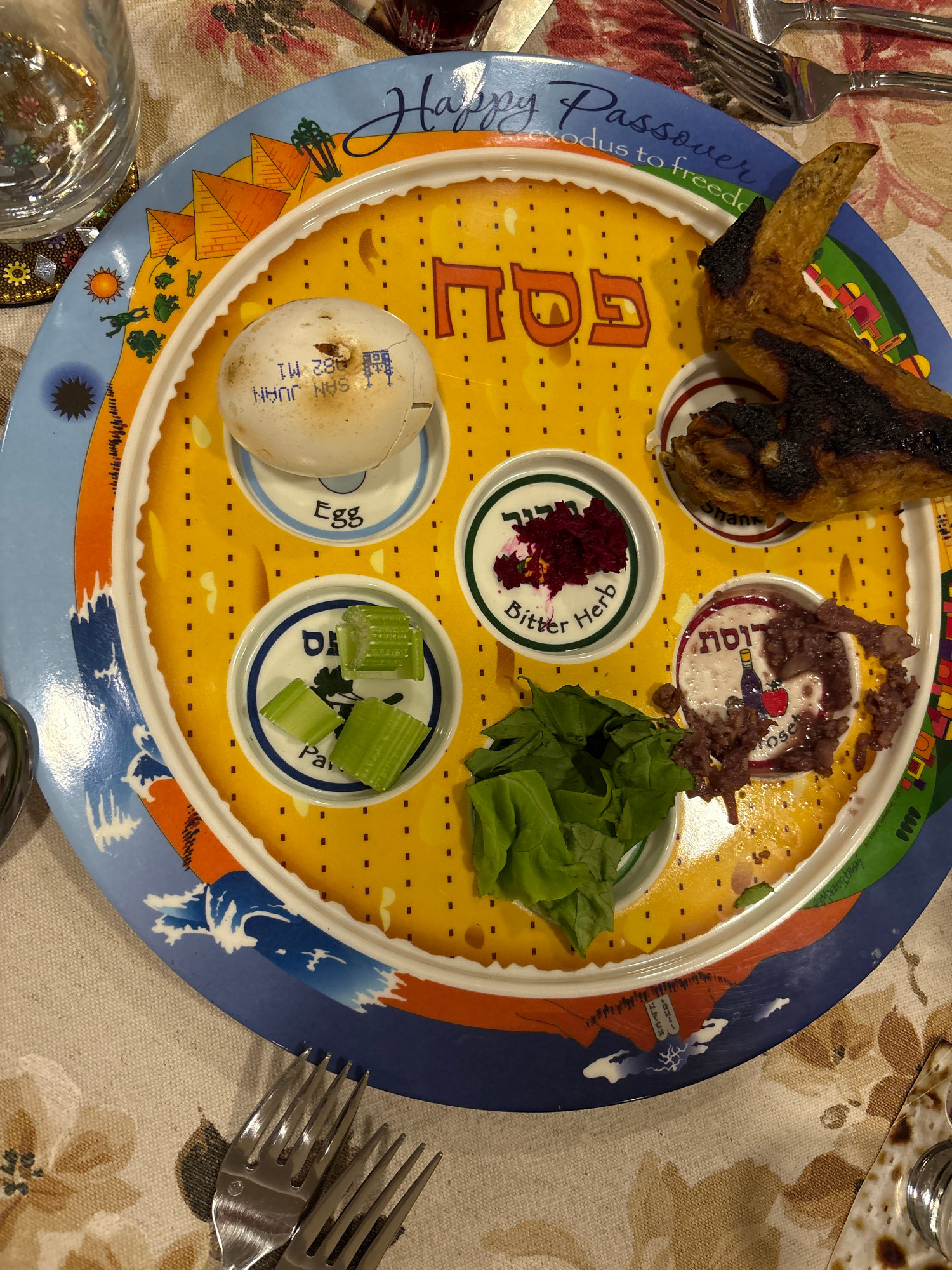 The image shows a Seder plate, used during the Jewish holiday of Passover, positioned on a tablecloth. The plate is divided into sections, each containing symbolic food items: a roasted shank bone, a…read more