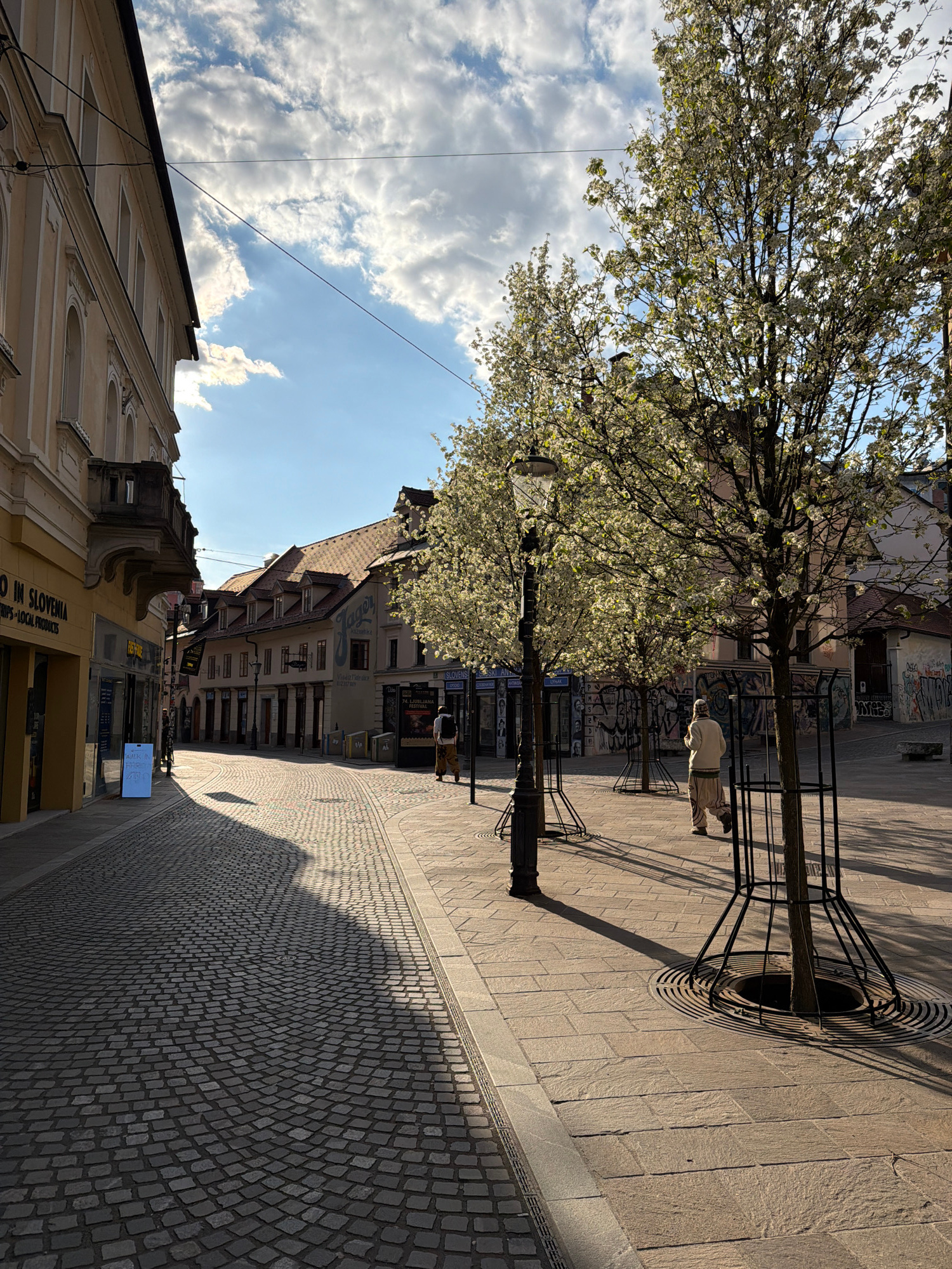 The image shows a street view in Ljubljana, Slovenia, possibly along Mestni Trg (Town Square). The scene is bathed in sunlight. The buildings lining the street have varied architectural styles, with s…read more