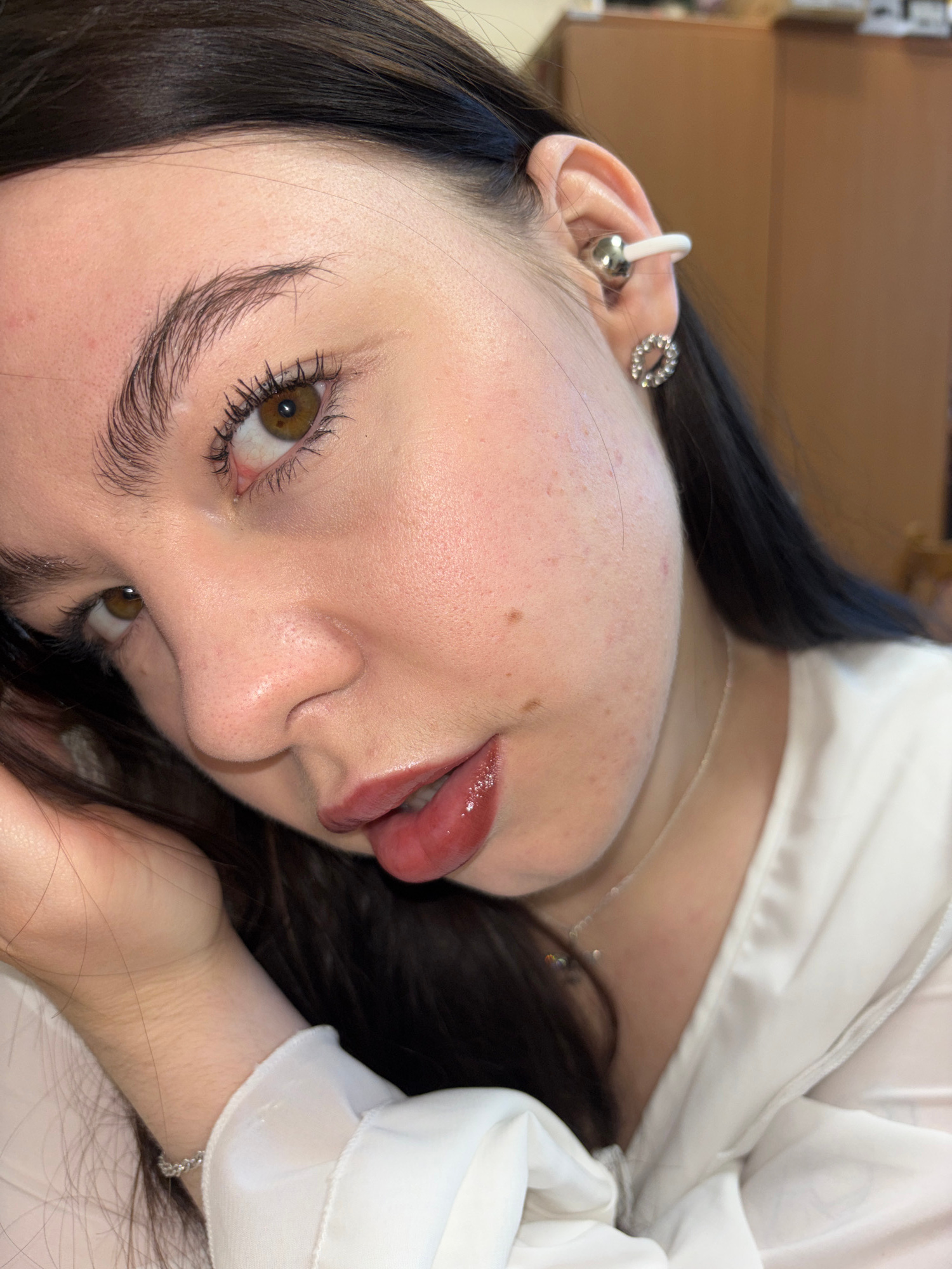 A close-up, angled view shows a woman's face, tilted towards the camera. She has dark hair, fair skin, and brown eyes. Her lips are glossy and slightly parted. She is wearing a white shirt or blouse.…read more