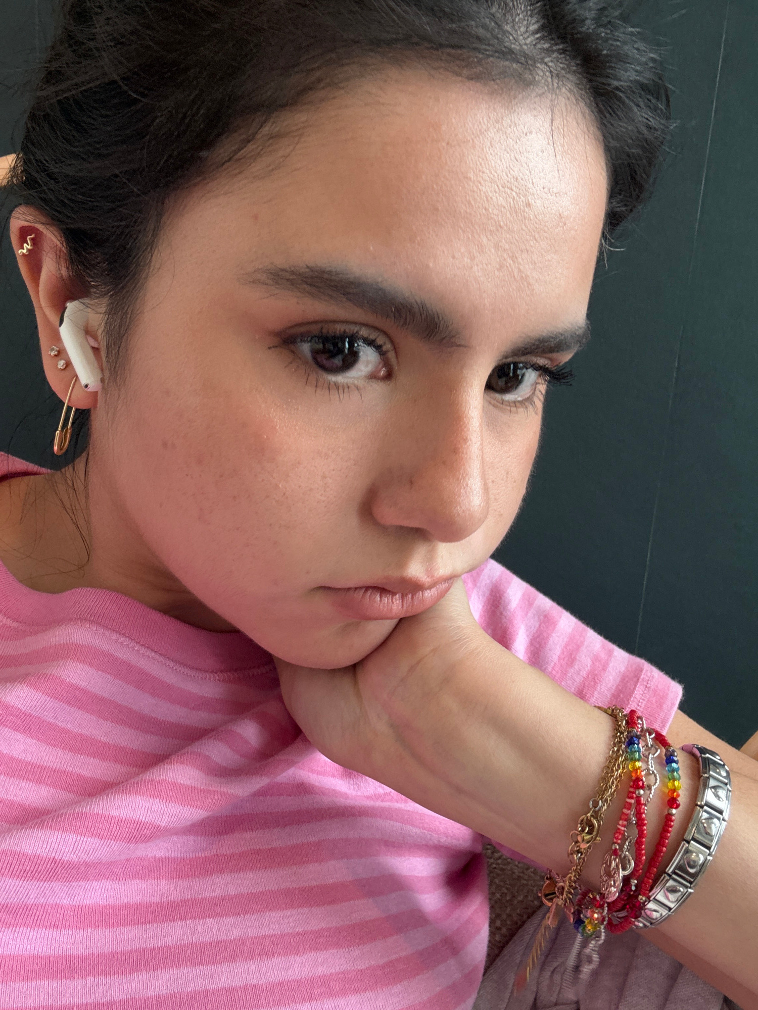 A close-up, slightly tilted shot features a person with dark hair, brown eyes, and fair skin, wearing a pink and white striped shirt. The person's left hand is supporting their chin. Several bracelets…read more