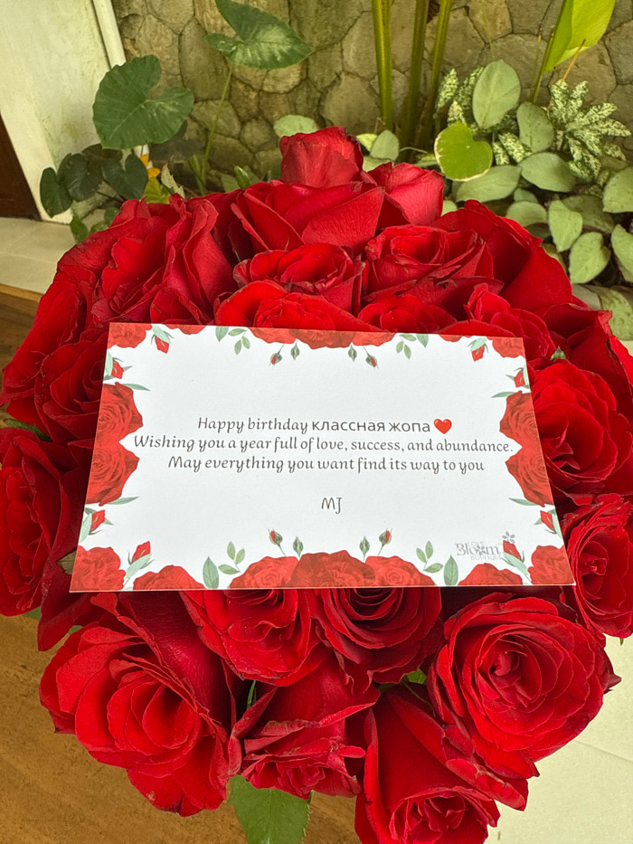 A bouquet of vibrant red roses surrounds a card. The card displays a birthday message in both English and Russian, wishing the recipient a year of love, success, and abundance. A small heart emoji acc…read more