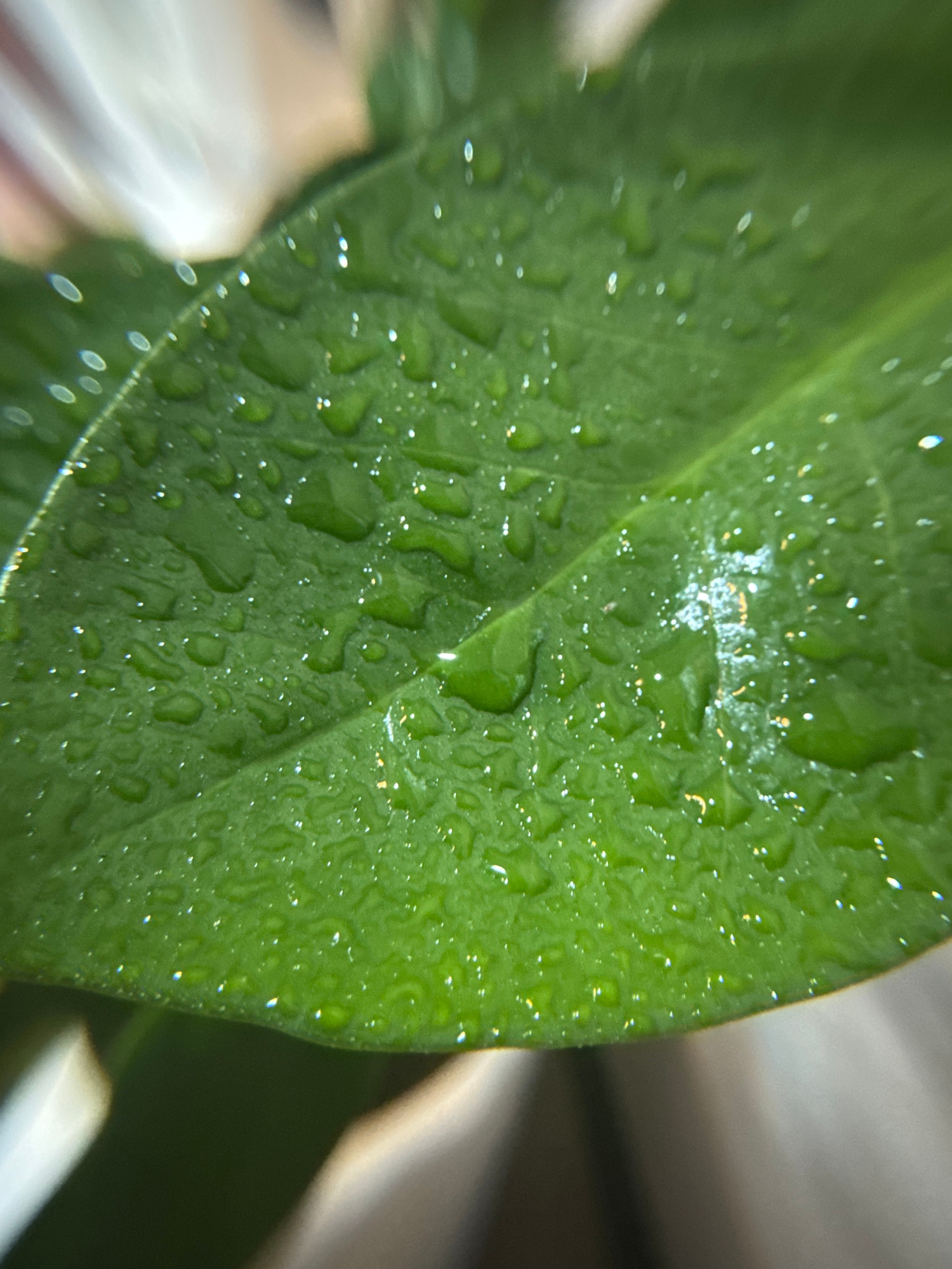 A close-up photograph captures a green leaf covered in water droplets. The droplets vary in size and distribution across the leaf surface, some reflecting light as small, bright highlights. The leaf's…read more