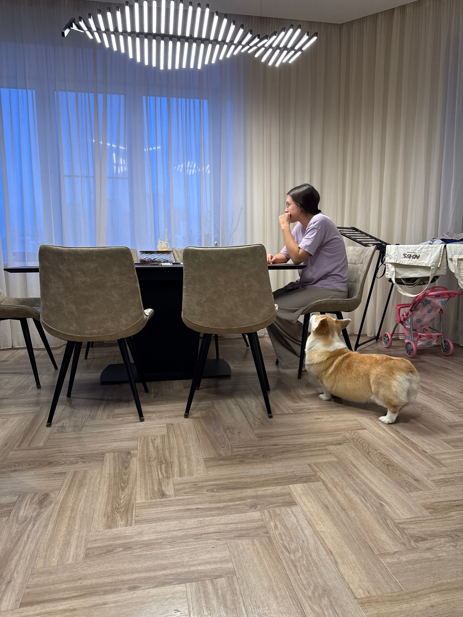 An indoor scene, likely a dining or living area in Krasnoyarsk, Russia, is captured from a slightly elevated perspective. A woman with dark hair, wearing a light purple t-shirt and grey pants, is leanβ¦read more