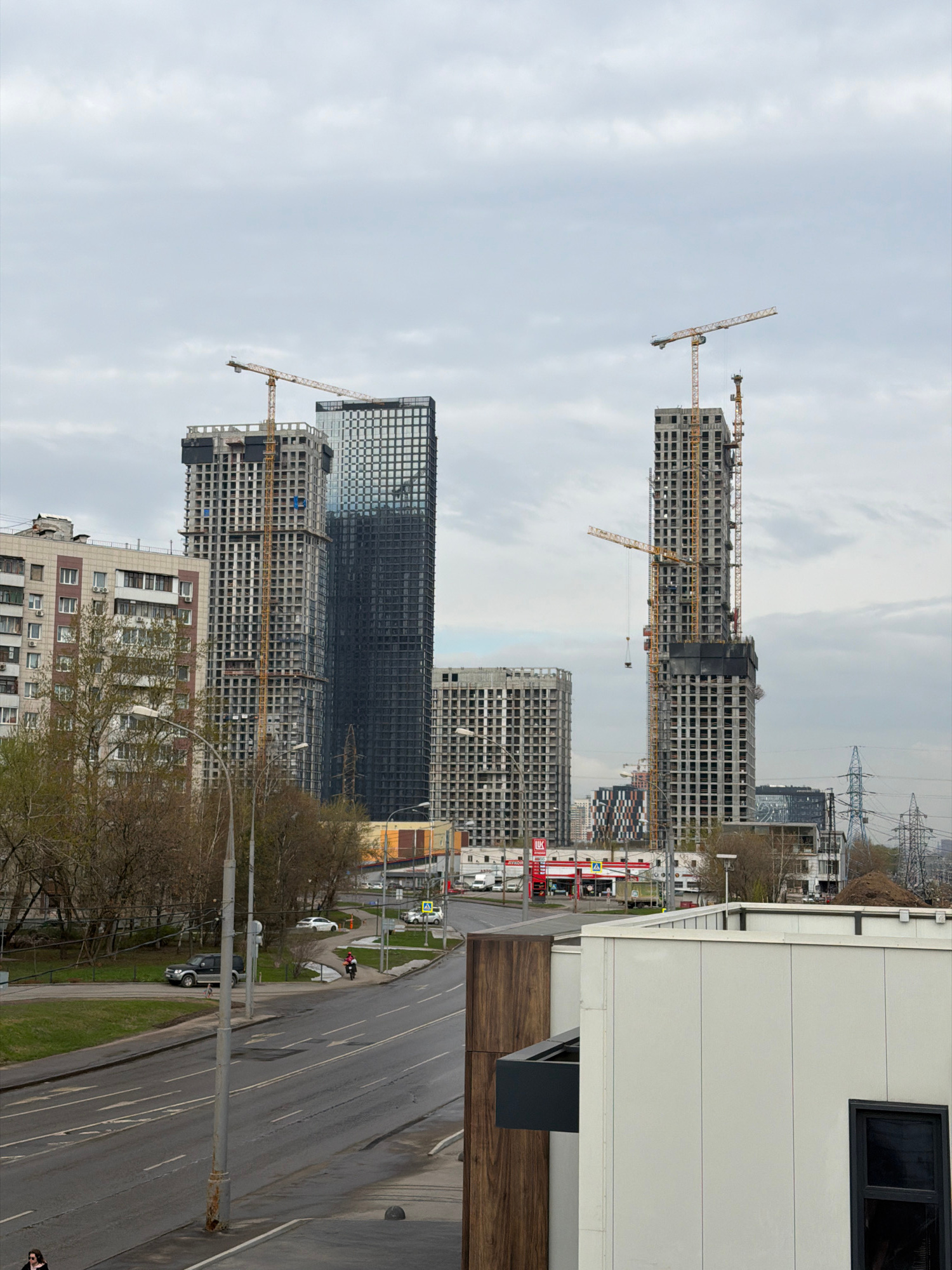 The image depicts a street in Moscow, Russia with several high-rise buildings under construction in the background. The buildings are skeletal structures with multiple cranes attached, indicating ongo…read more
