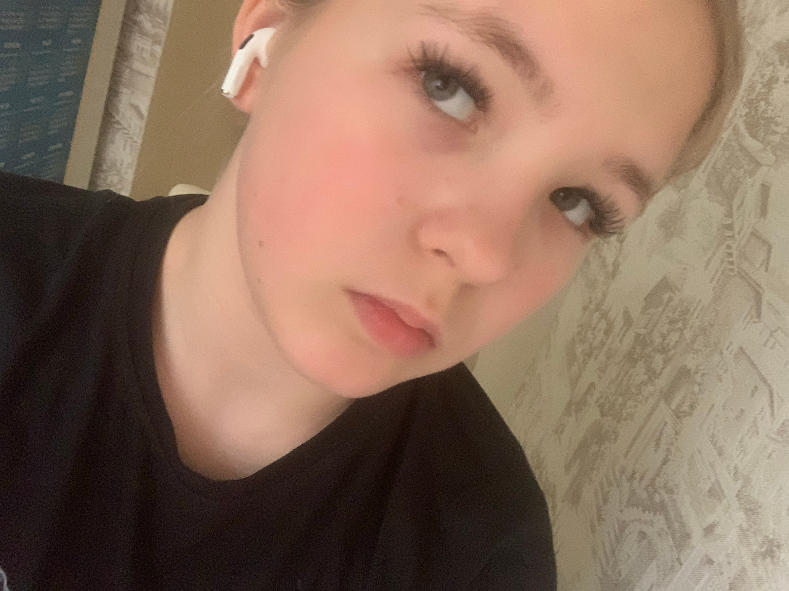 A close-up, slightly angled portrait shows a fair-skinned young woman with light blonde hair. She is wearing a dark-colored top, possibly a sweatshirt or hoodie. An earbud is visible in her right ear.…read more