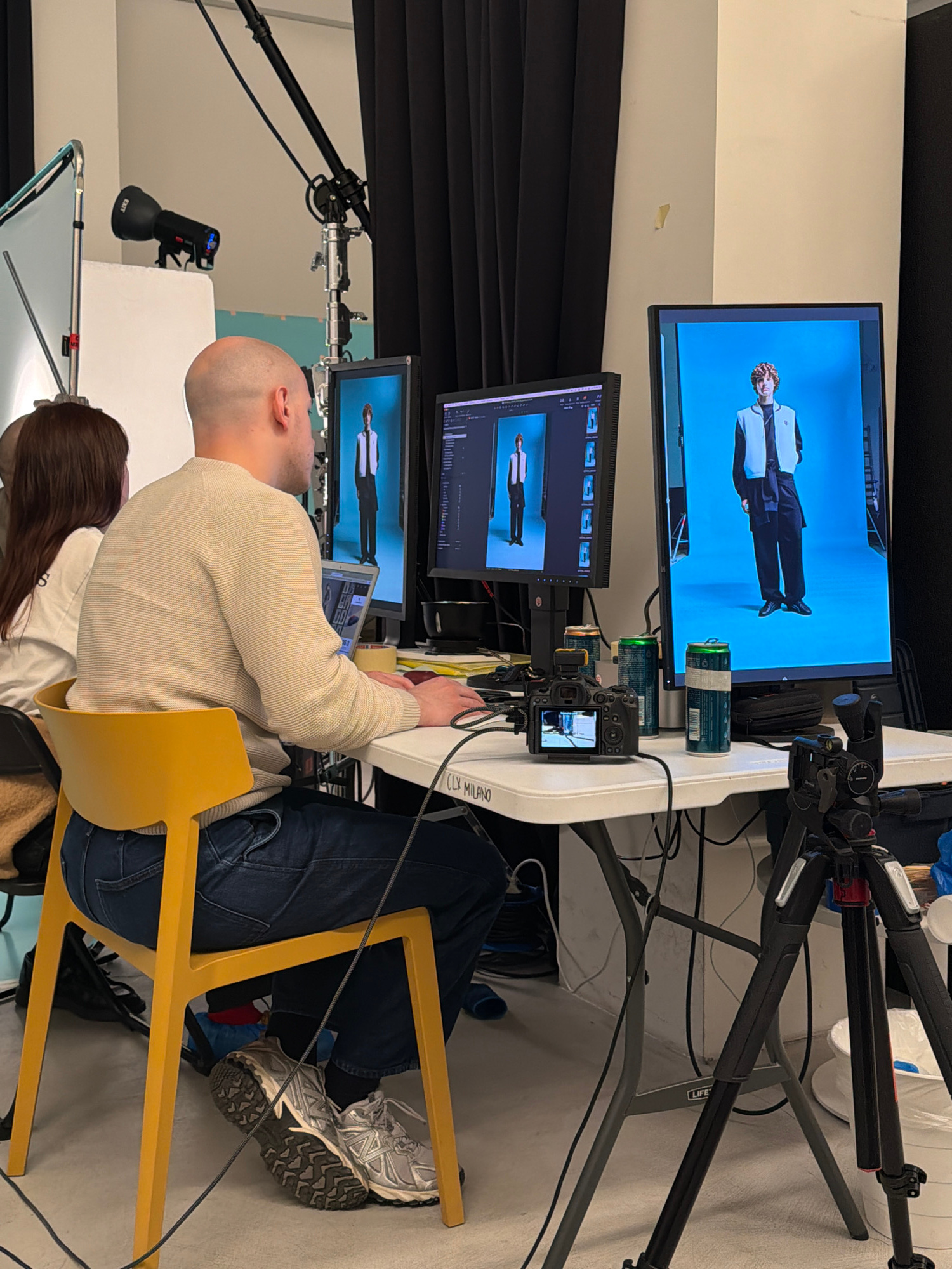 The image captures a scene from a photoshoot occurring indoors, presumably in a studio. A man with a shaved head, wearing a beige sweater and blue jeans, sits on a yellow chair in front of a white des…read more