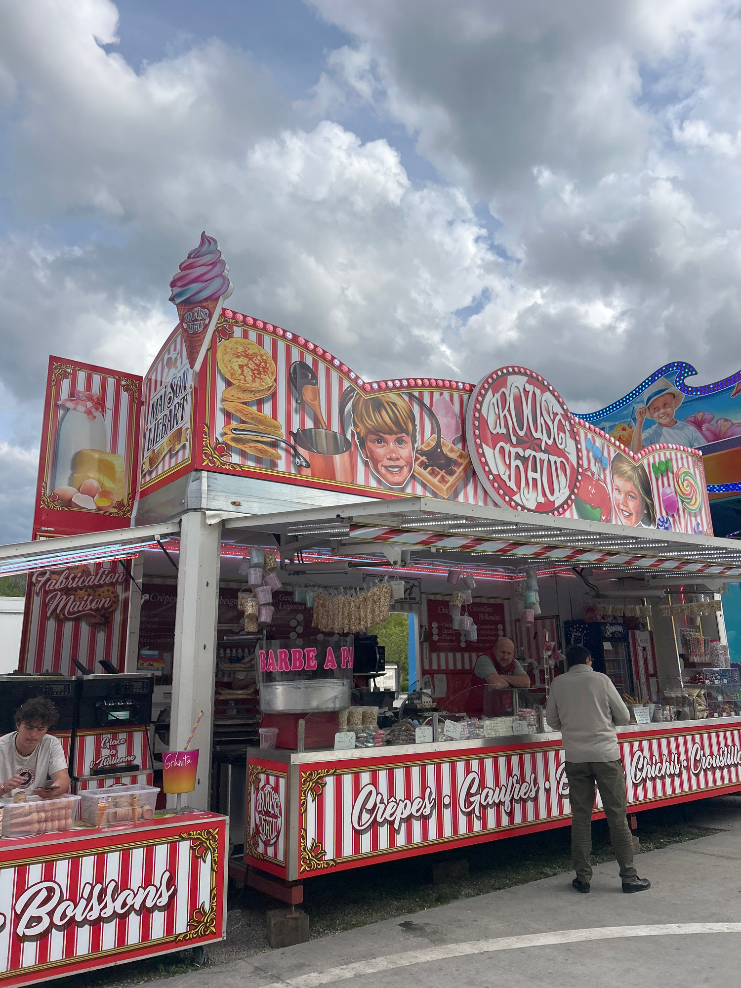 The image shows a confectionary stall in Lille, France, selling various sweet treats. The stall is decorated with red and white stripes and images of sweets and people. The stall has a sign that reads…read more