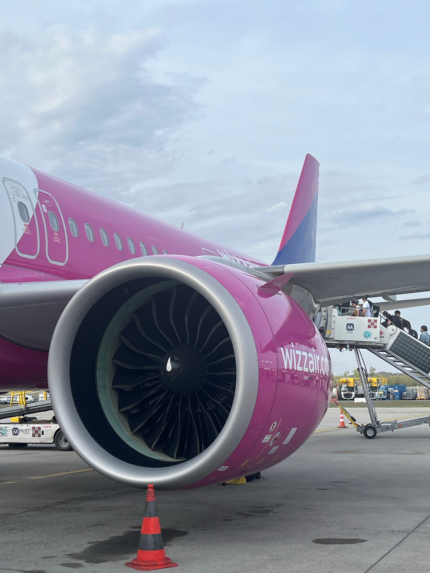 The image shows a Wizzair Airbus airplane engine. The plane is magenta with the "Wizzair.com" logo displayed on the engine. An orange traffic cone is located near the engine. A jet bridge is connectedβ¦read more