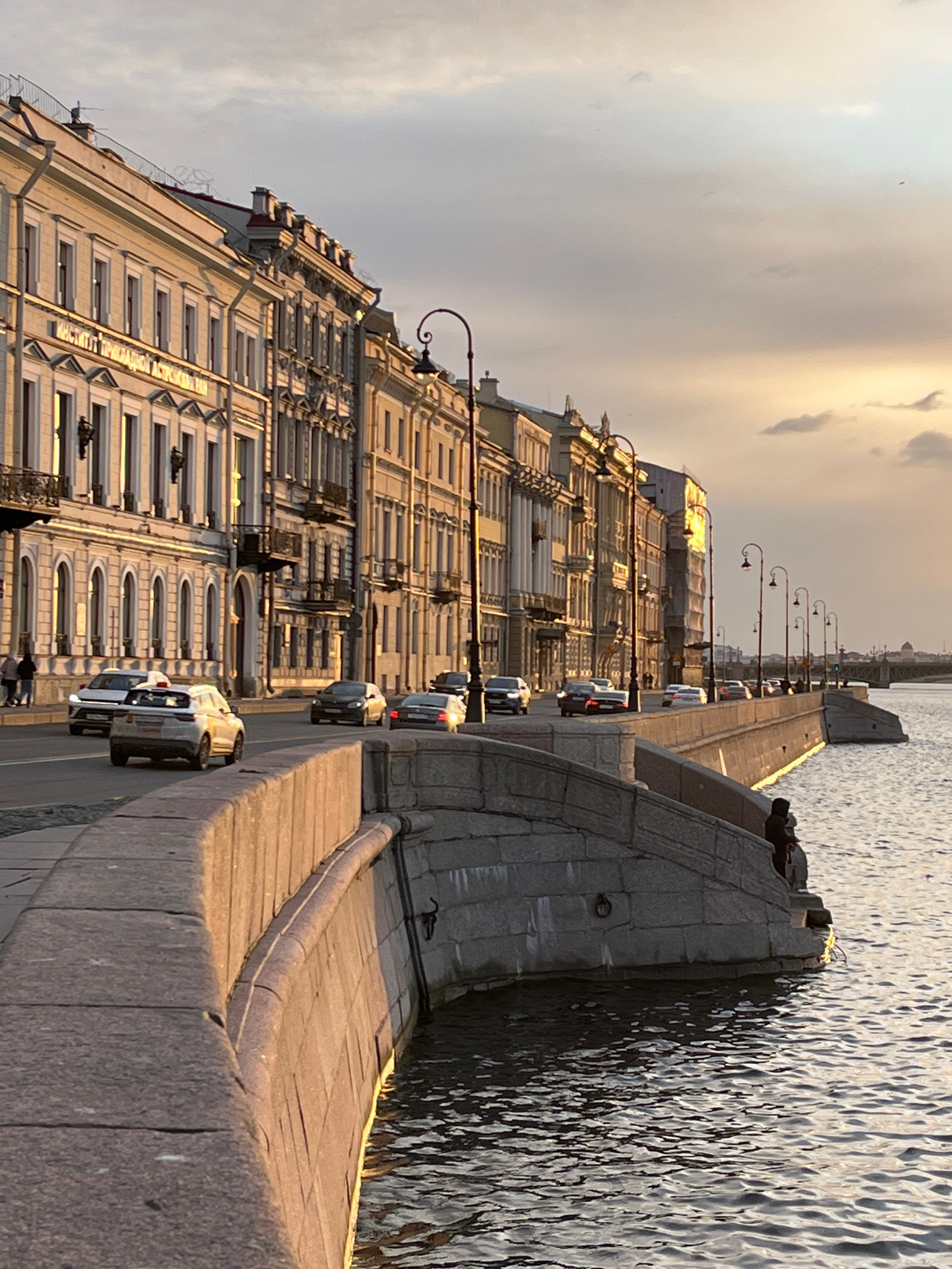 The image depicts a view of a cityscape alongside a waterway in Saint Petersburg, Russia. Buildings with classical facades line the street along the embankment, their architectural details illuminated…read more