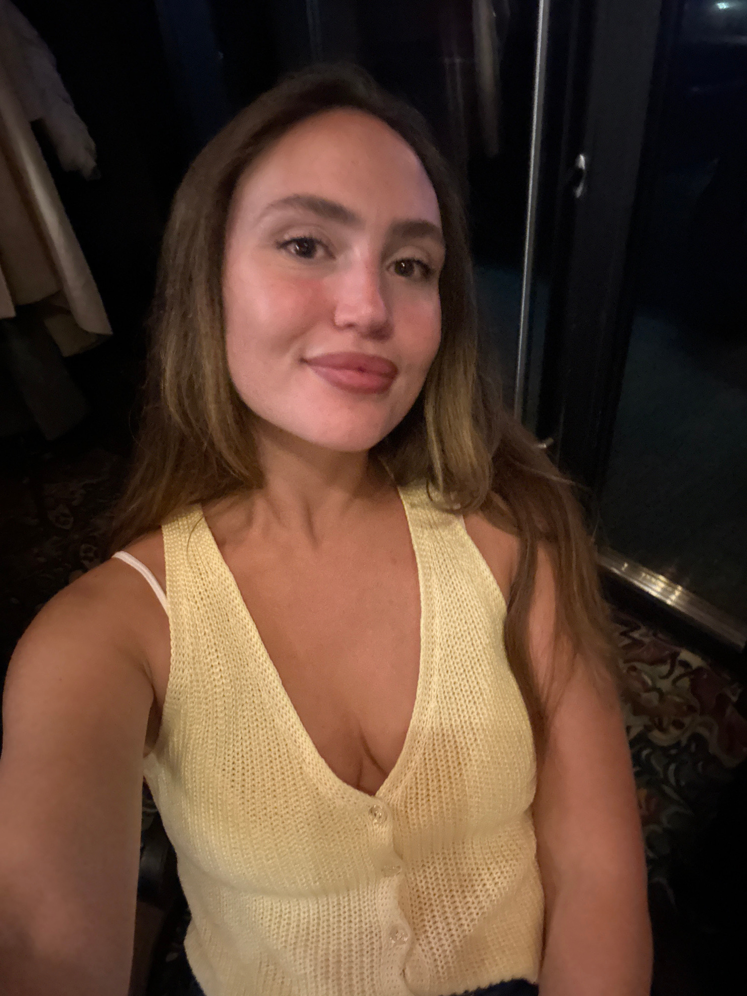 A woman with long brown hair and fair skin is pictured wearing a light yellow knitted top. She is in an indoor environment that appears dimly lit. The top of a black cabinet or shelf is visible in the…read more